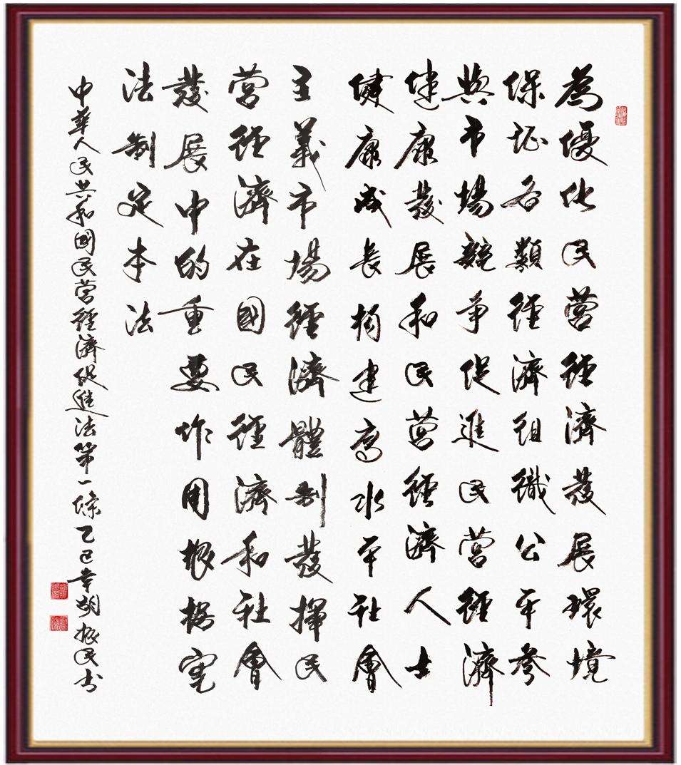 《中華人民共和國(guó)民營(yíng)經(jīng)濟(jì)促進(jìn)法》自今年5月20日起施行。作為我國(guó)首部專門關(guān)于民營(yíng)經(jīng)濟(jì)發(fā)展的基礎(chǔ)性法律,民營(yíng)經(jīng)濟(jì)促進(jìn)法將支持和保障民營(yíng)經(jīng)濟(jì)發(fā)展的法律制度融入中國(guó)特色社會(huì)主義法律體系,具有重大的法治意義,為促進(jìn)民營(yíng)經(jīng)濟(jì)持續(xù)、健康、高質(zhì)量發(fā)展提供了堅(jiān)實(shí)的法治保障。為更好地學(xué)習(xí)、宣傳、貫徹這部法律,法治日?qǐng)?bào)社聯(lián)合司法部普法與依法治理局,開展“‘書·法’系列活動(dòng)之書寫《中華人民共和國(guó)民營(yíng)經(jīng)濟(jì)促進(jìn)法》”活動(dòng)。