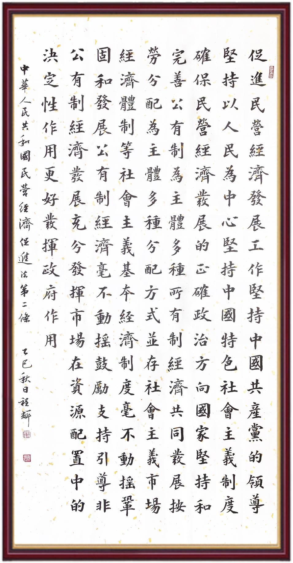《中華人民共和國(guó)民營(yíng)經(jīng)濟(jì)促進(jìn)法》自今年5月20日起施行。作為我國(guó)首部專(zhuān)門(mén)關(guān)于民營(yíng)經(jīng)濟(jì)發(fā)展的基礎(chǔ)性法律,民營(yíng)經(jīng)濟(jì)促進(jìn)法將支持和保障民營(yíng)經(jīng)濟(jì)發(fā)展的法律制度融入中國(guó)特色社會(huì)主義法律體系,具有重大的法治意義,為促進(jìn)民營(yíng)經(jīng)濟(jì)持續(xù)、健康、高質(zhì)量發(fā)展提供了堅(jiān)實(shí)的法治保障。為更好地學(xué)習(xí)、宣傳、貫徹這部法律,法治日?qǐng)?bào)社聯(lián)合司法部普法與依法治理局,開(kāi)展“‘書(shū)·法’系列活動(dòng)之書(shū)寫(xiě)《中華人民共和國(guó)民營(yíng)經(jīng)濟(jì)促進(jìn)法》”活動(dòng)。