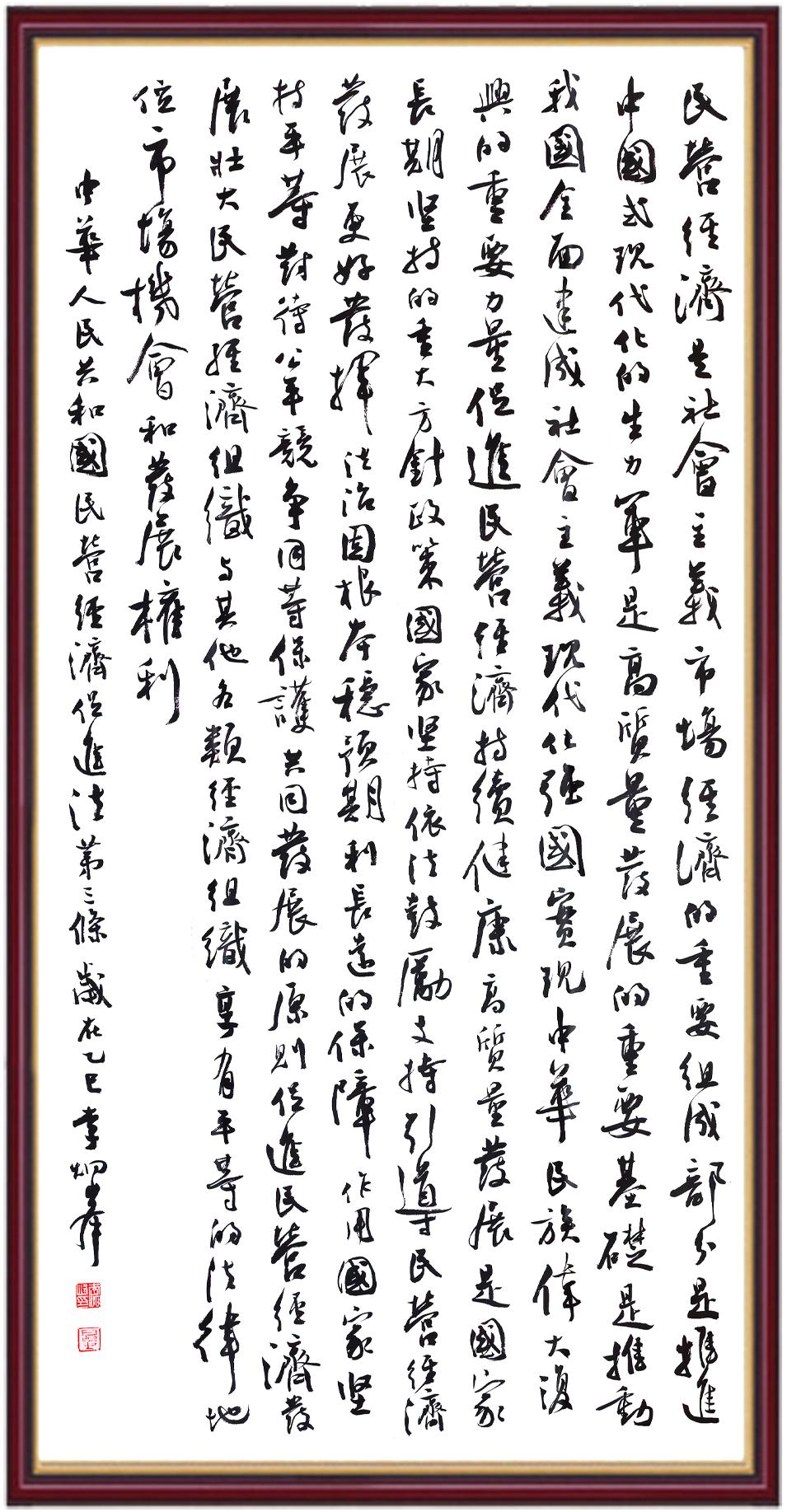 《中華人民共和國民營經(jīng)濟(jì)促進(jìn)法》自今年5月20日起施行。作為我國首部專門關(guān)于民營經(jīng)濟(jì)發(fā)展的基礎(chǔ)性法律,民營經(jīng)濟(jì)促進(jìn)法將支持和保障民營經(jīng)濟(jì)發(fā)展的法律制度融入中國特色社會(huì)主義法律體系,具有重大的法治意義,為促進(jìn)民營經(jīng)濟(jì)持續(xù)、健康、高質(zhì)量發(fā)展提供了堅(jiān)實(shí)的法治保障。為更好地學(xué)習(xí)、宣傳、貫徹這部法律,法治日?qǐng)?bào)社聯(lián)合司法部普法與依法治理局,開展“‘書·法’系列活動(dòng)之書寫《中華人民共和國民營經(jīng)濟(jì)促進(jìn)法》”活動(dòng)。