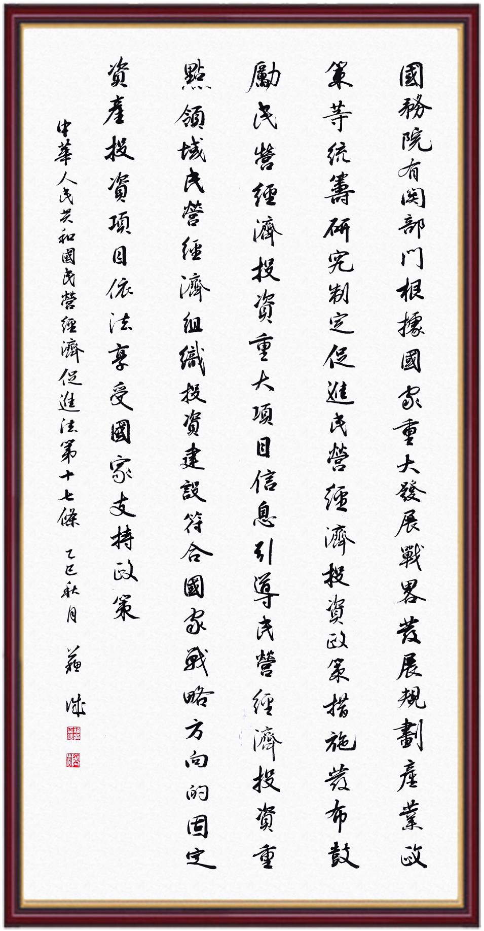 《中華人民共和國民營經(jīng)濟(jì)促進(jìn)法》自今年5月20日起施行。作為我國首部專門關(guān)于民營經(jīng)濟(jì)發(fā)展的基礎(chǔ)性法律,民營經(jīng)濟(jì)促進(jìn)法將支持和保障民營經(jīng)濟(jì)發(fā)展的法律制度融入中國特色社會主義法律體系,具有重大的法治意義,為促進(jìn)民營經(jīng)濟(jì)持續(xù)、健康、高質(zhì)量發(fā)展提供了堅實(shí)的法治保障。為更好地學(xué)習(xí)、宣傳、貫徹這部法律,法治日報社聯(lián)合司法部普法與依法治理局,開展“‘書·法’系列活動之書寫《中華人民共和國民營經(jīng)濟(jì)促進(jìn)法》”活動。