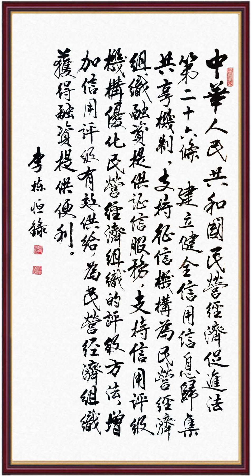 《中華人民共和國民營經(jīng)濟促進法》自今年5月20日起施行。作為我國首部專門關(guān)于民營經(jīng)濟發(fā)展的基礎(chǔ)性法律,民營經(jīng)濟促進法將支持和保障民營經(jīng)濟發(fā)展的法律制度融入中國特色社會主義法律體系,具有重大的法治意義,為促進民營經(jīng)濟持續(xù)、健康、高質(zhì)量發(fā)展提供了堅實的法治保障。為更好地學(xué)習(xí)、宣傳、貫徹這部法律,法治日報社聯(lián)合司法部普法與依法治理局,開展“‘書·法’系列活動之書寫《中華人民共和國民營經(jīng)濟促進法》”活動。