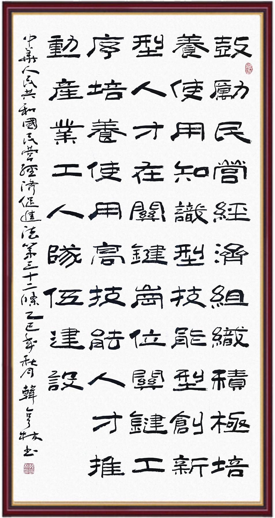 《中華人民共和國民營經(jīng)濟(jì)促進(jìn)法》自今年5月20日起施行。作為我國首部專門關(guān)于民營經(jīng)濟(jì)發(fā)展的基礎(chǔ)性法律,民營經(jīng)濟(jì)促進(jìn)法將支持和保障民營經(jīng)濟(jì)發(fā)展的法律制度融入中國特色社會主義法律體系,具有重大的法治意義,為促進(jìn)民營經(jīng)濟(jì)持續(xù)、健康、高質(zhì)量發(fā)展提供了堅(jiān)實(shí)的法治保障。為更好地學(xué)習(xí)、宣傳、貫徹這部法律,法治日報(bào)社聯(lián)合司法部普法與依法治理局,開展“‘書·法’系列活動(dòng)之書寫《中華人民共和國民營經(jīng)濟(jì)促進(jìn)法》”活動(dòng)。