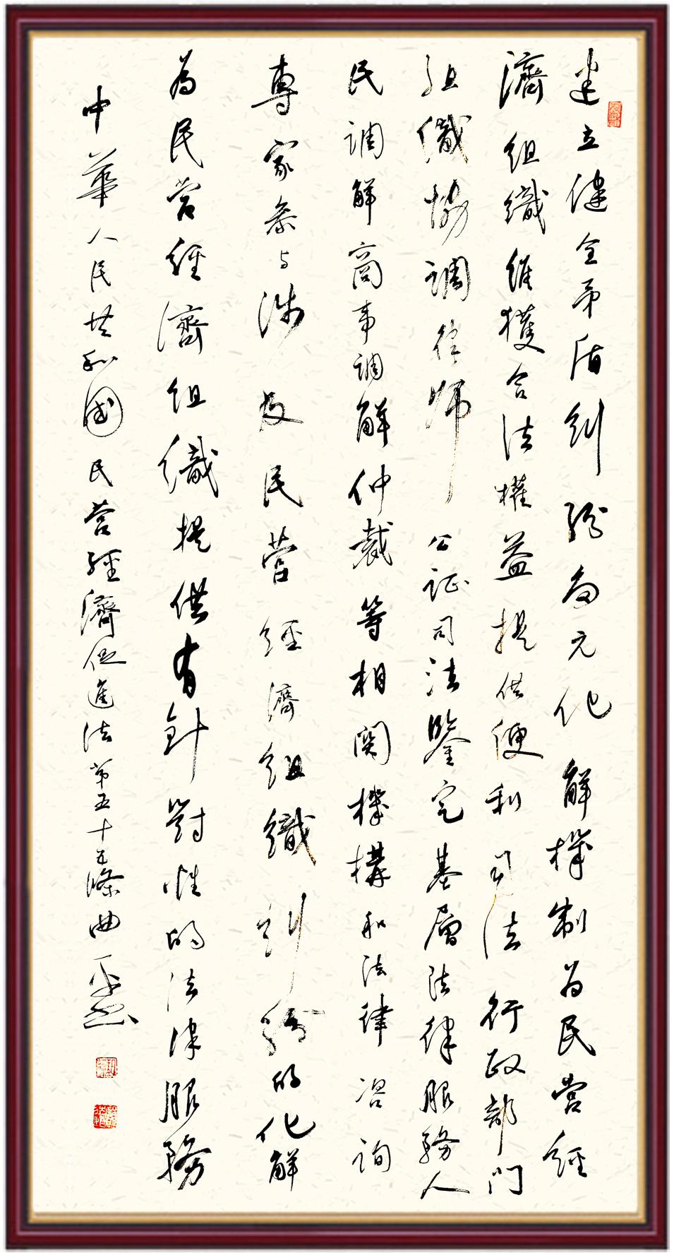 《中華人民共和國民營經(jīng)濟(jì)促進(jìn)法》自今年5月20日起施行。作為我國首部專門關(guān)于民營經(jīng)濟(jì)發(fā)展的基礎(chǔ)性法律,民營經(jīng)濟(jì)促進(jìn)法將支持和保障民營經(jīng)濟(jì)發(fā)展的法律制度融入中國特色社會(huì)主義法律體系,具有重大的法治意義,為促進(jìn)民營經(jīng)濟(jì)持續(xù)、健康、高質(zhì)量發(fā)展提供了堅(jiān)實(shí)的法治保障。為更好地學(xué)習(xí)、宣傳、貫徹這部法律,法治日報(bào)社聯(lián)合司法部普法與依法治理局,開展“‘書·法’系列活動(dòng)之書寫《中華人民共和國民營經(jīng)濟(jì)促進(jìn)法》”活動(dòng)。