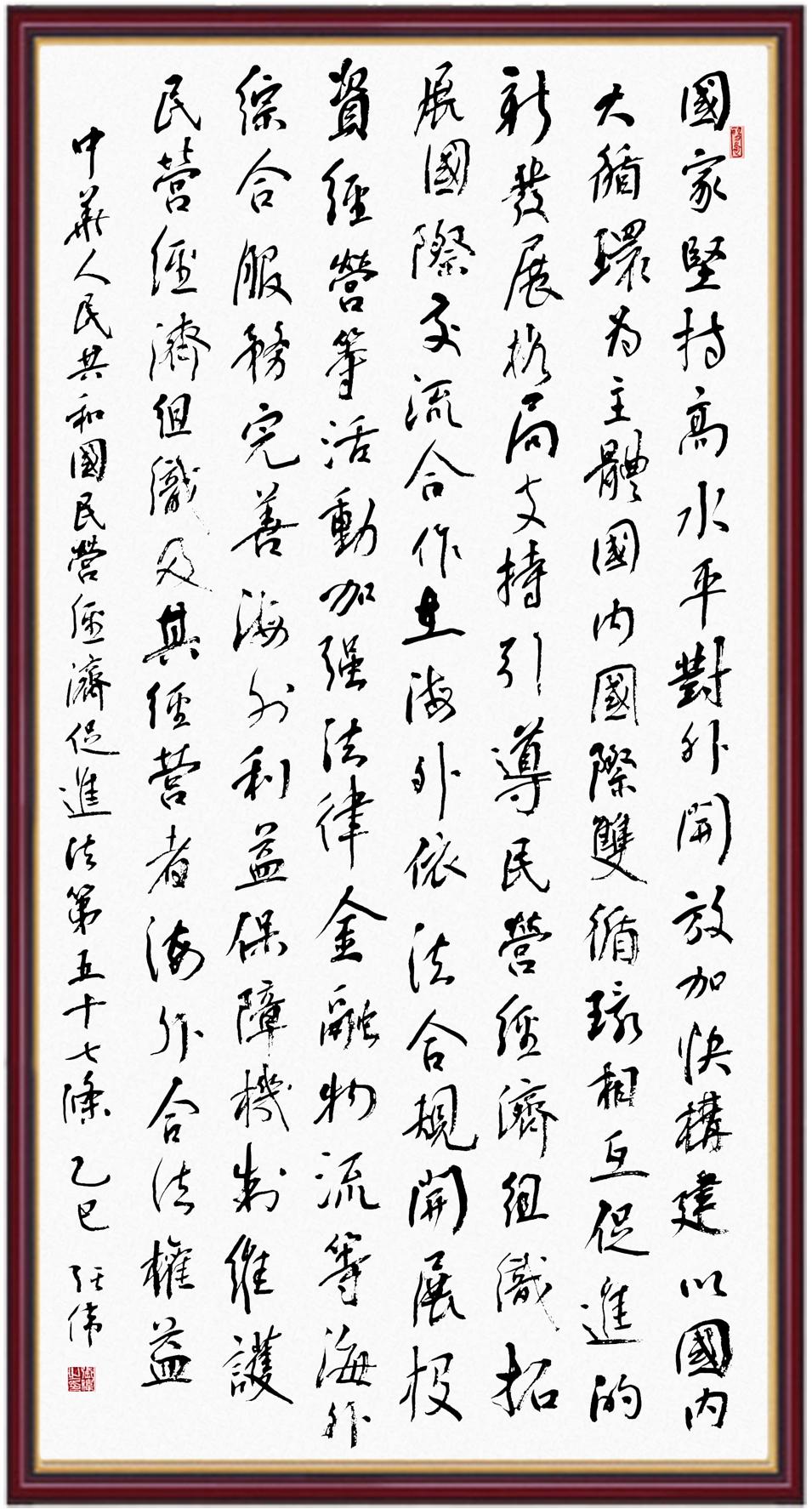 《中華人民共和國民營經濟促進法》自今年5月20日起施行。作為我國首部專門關于民營經濟發(fā)展的基礎性法律,民營經濟促進法將支持和保障民營經濟發(fā)展的法律制度融入中國特色社會主義法律體系,具有重大的法治意義,為促進民營經濟持續(xù)、健康、高質量發(fā)展提供了堅實的法治保障。為更好地學習、宣傳、貫徹這部法律,法治日報社聯(lián)合司法部普法與依法治理局,開展“‘書·法’系列活動之書寫《中華人民共和國民營經濟促進法》”活動。