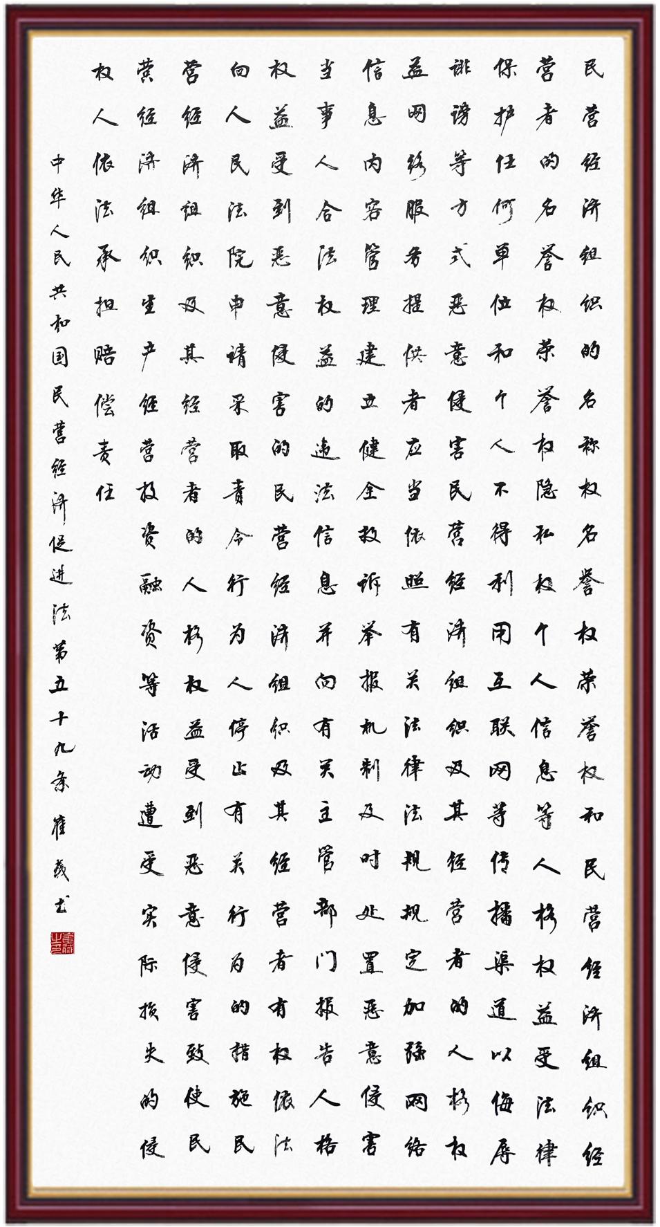 《中華人民共和國(guó)民營(yíng)經(jīng)濟(jì)促進(jìn)法》自今年5月20日起施行。作為我國(guó)首部專(zhuān)門(mén)關(guān)于民營(yíng)經(jīng)濟(jì)發(fā)展的基礎(chǔ)性法律,民營(yíng)經(jīng)濟(jì)促進(jìn)法將支持和保障民營(yíng)經(jīng)濟(jì)發(fā)展的法律制度融入中國(guó)特色社會(huì)主義法律體系,具有重大的法治意義,為促進(jìn)民營(yíng)經(jīng)濟(jì)持續(xù)、健康、高質(zhì)量發(fā)展提供了堅(jiān)實(shí)的法治保障。為更好地學(xué)習(xí)、宣傳、貫徹這部法律,法治日?qǐng)?bào)社聯(lián)合司法部普法與依法治理局,開(kāi)展“‘書(shū)·法’系列活動(dòng)之書(shū)寫(xiě)《中華人民共和國(guó)民營(yíng)經(jīng)濟(jì)促進(jìn)法》”活動(dòng)。