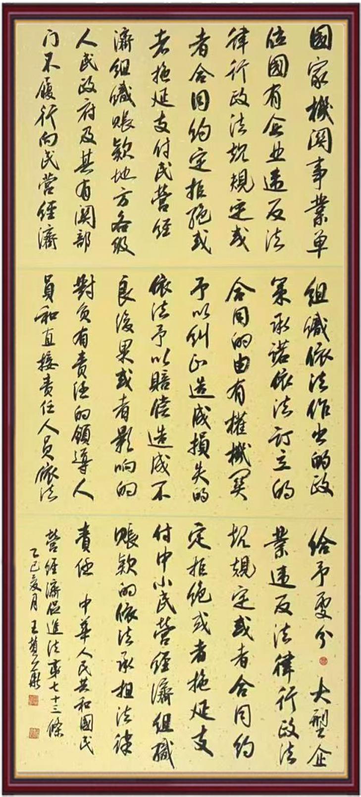 2020年7月11日,由法治日報社主辦、法報文化傳媒(北京)有限公司和北京千音文化傳媒有限公司聯(lián)合承辦的“書·法”系列活動正式啟動?!皶しā被顒又荚跒閯?chuàng)新法治宣傳教育,多開一點(diǎn)腦洞、多花一點(diǎn)心思、多出一點(diǎn)力量、多作一點(diǎn)貢獻(xiàn),引領(lǐng)和推動更多的人拿起筆來學(xué)法、寫法,在不斷“書·法”過程中,提升自身的法治素養(yǎng),在全社會弘揚(yáng)法治精神。先后書寫《中華人民共和國民法典》《中華人民共和國憲法》《中華人民共和國澳門特別行政區(qū)基本法》《中華人民共和國香港特別行政區(qū)基本法》《中華人民共和國國旗法》《中華人民共和國國徽法》《中華人民共和國國歌法》《中華人民共和國法官法》《中華人民共和國黃河保護(hù)法》等19部法律法規(guī)。