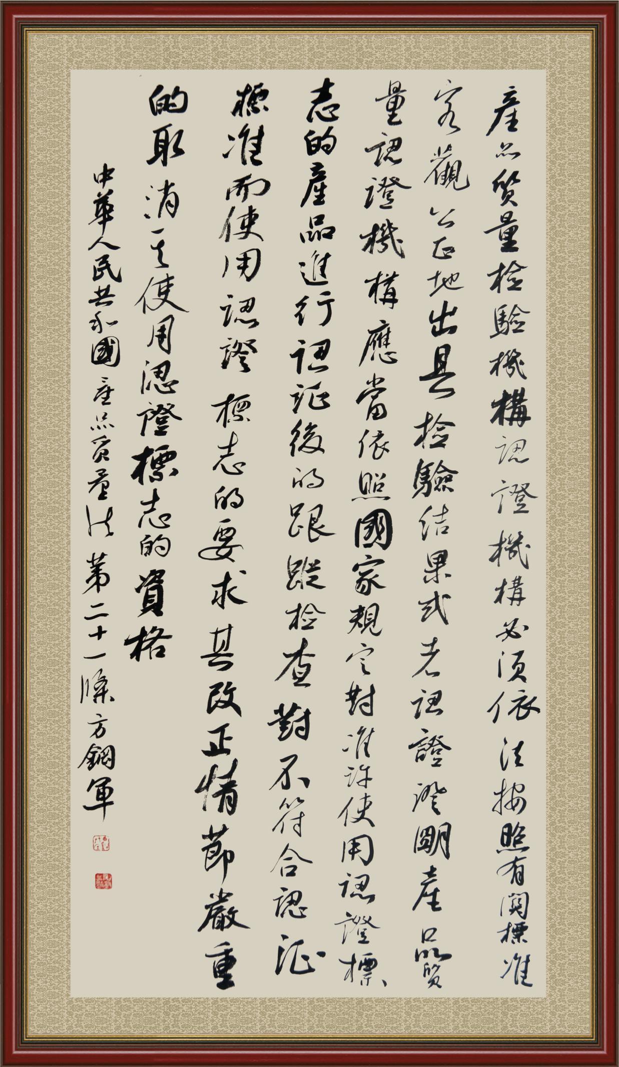 《中華人民共和國產(chǎn)品質(zhì)量法》自1993年9月1日起開始施行,先后進行三次修正。作為產(chǎn)品質(zhì)量領(lǐng)域的基本法律,產(chǎn)品質(zhì)量法對規(guī)范產(chǎn)品質(zhì)量管理、維護消費者合法權(quán)益、促進經(jīng)濟社會發(fā)展具有重要意義。為更好地學(xué)習(xí)、宣傳、貫徹這部法律,在國家市場監(jiān)督管理總局法規(guī)司的支持下,法治日報社開展了“‘書·法’系列活動之書寫《中華人民共和國產(chǎn)品質(zhì)量法》”活動。