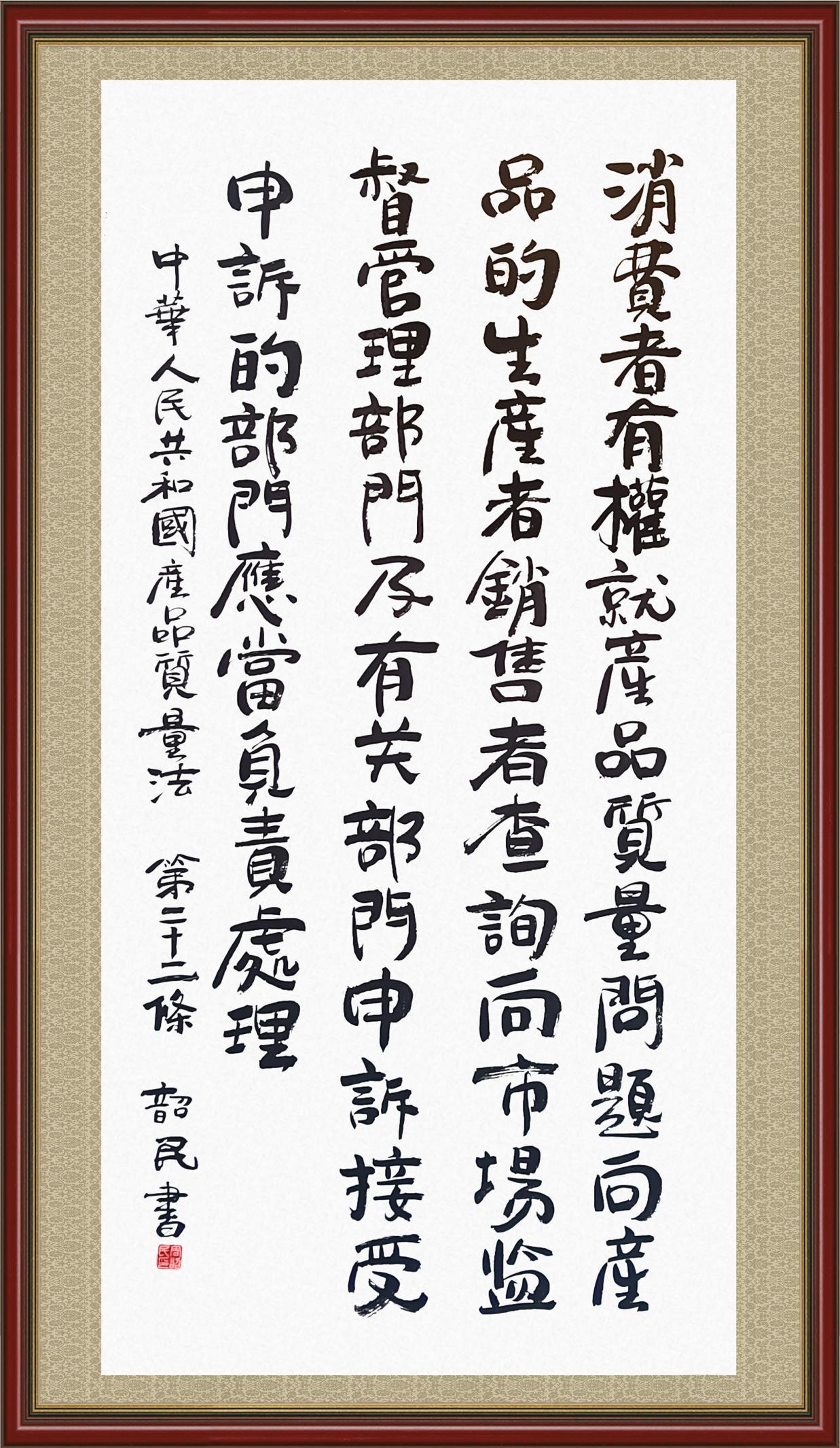 《中華人民共和國(guó)產(chǎn)品質(zhì)量法》自1993年9月1日起開(kāi)始施行,先后進(jìn)行三次修正。作為產(chǎn)品質(zhì)量領(lǐng)域的基本法律,產(chǎn)品質(zhì)量法對(duì)規(guī)范產(chǎn)品質(zhì)量管理、維護(hù)消費(fèi)者合法權(quán)益、促進(jìn)經(jīng)濟(jì)社會(huì)發(fā)展具有重要意義。為更好地學(xué)習(xí)、宣傳、貫徹這部法律,在國(guó)家市場(chǎng)監(jiān)督管理總局法規(guī)司的支持下,法治日?qǐng)?bào)社開(kāi)展了“‘書·法’系列活動(dòng)之書寫《中華人民共和國(guó)產(chǎn)品質(zhì)量法》”活動(dòng)。