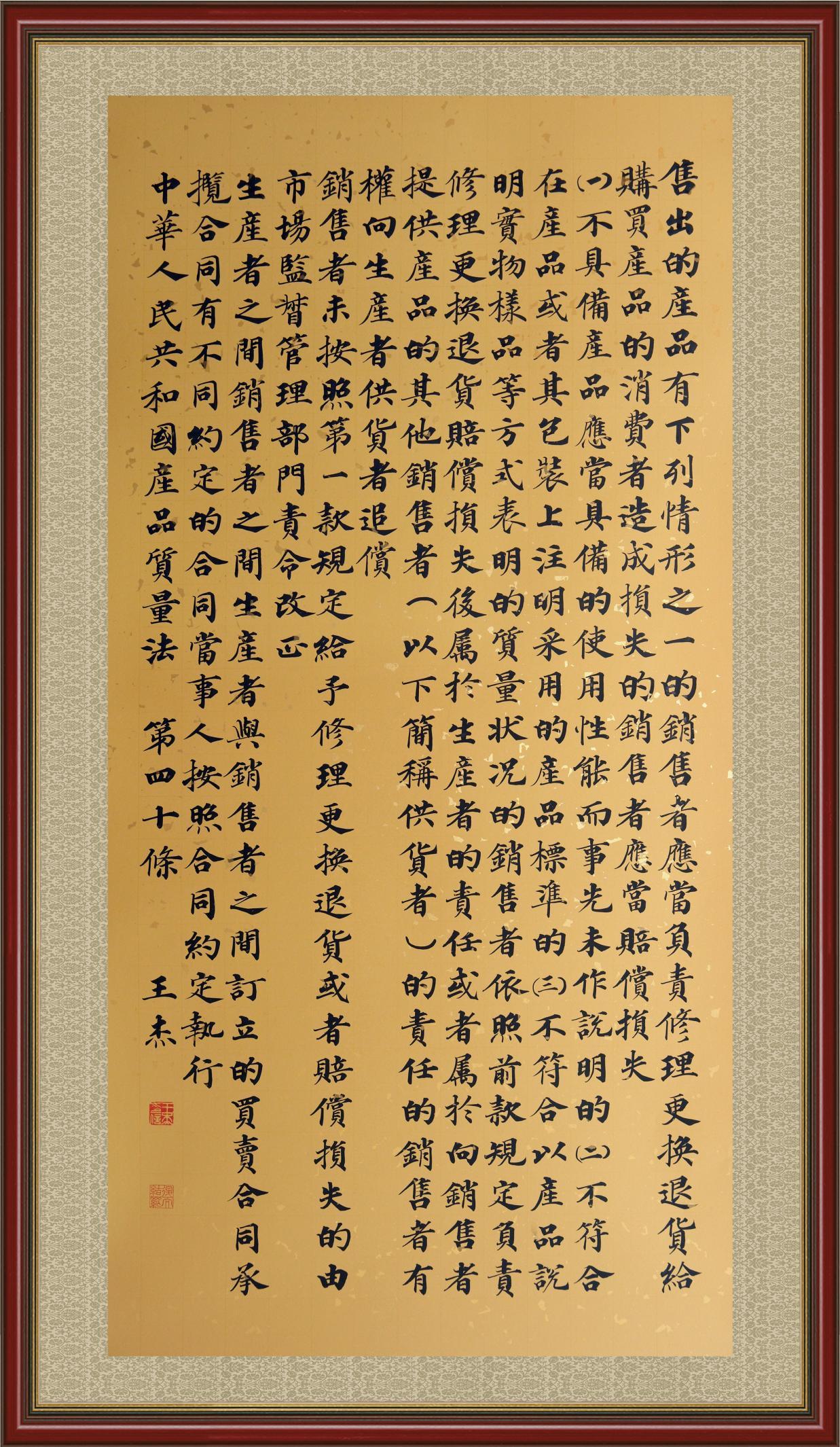 《中華人民共和國產(chǎn)品質量法》自1993年9月1日起開始施行,先后進行三次修正。作為產(chǎn)品質量領域的基本法律,產(chǎn)品質量法對規(guī)范產(chǎn)品質量管理、維護消費者合法權益、促進經(jīng)濟社會發(fā)展具有重要意義。為更好地學習、宣傳、貫徹這部法律,在國家市場監(jiān)督管理總局法規(guī)司的支持下,法治日報社開展了“‘書·法’系列活動之書寫《中華人民共和國產(chǎn)品質量法》”活動。