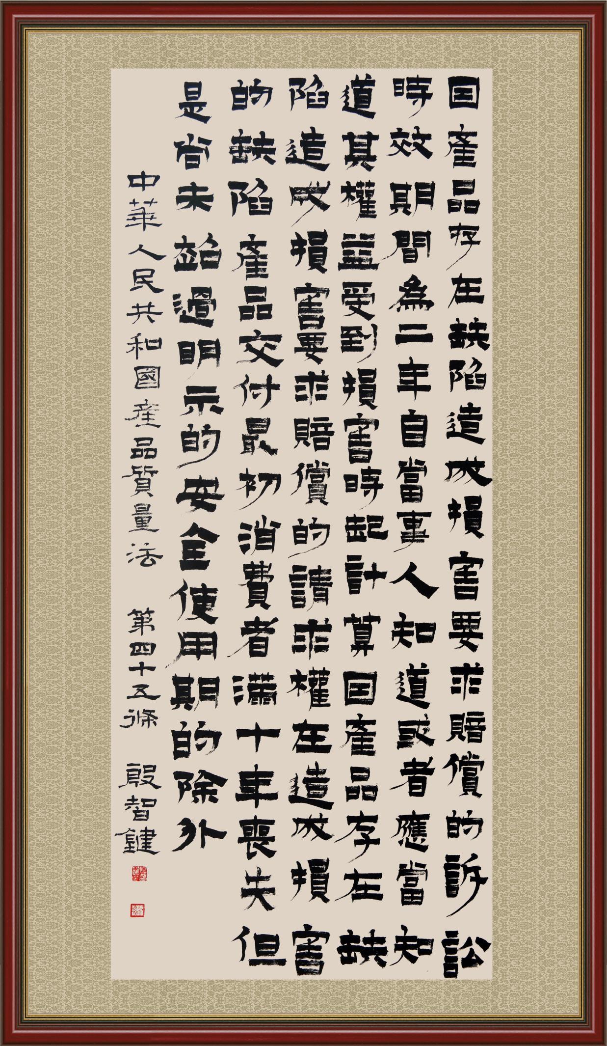 《中華人民共和國產(chǎn)品質(zhì)量法》自1993年9月1日起開始施行,先后進(jìn)行三次修正。作為產(chǎn)品質(zhì)量領(lǐng)域的基本法律,產(chǎn)品質(zhì)量法對規(guī)范產(chǎn)品質(zhì)量管理、維護(hù)消費者合法權(quán)益、促進(jìn)經(jīng)濟(jì)社會發(fā)展具有重要意義。為更好地學(xué)習(xí)、宣傳、貫徹這部法律,在國家市場監(jiān)督管理總局法規(guī)司的支持下,法治日報社開展了“‘書·法’系列活動之書寫《中華人民共和國產(chǎn)品質(zhì)量法》”活動。