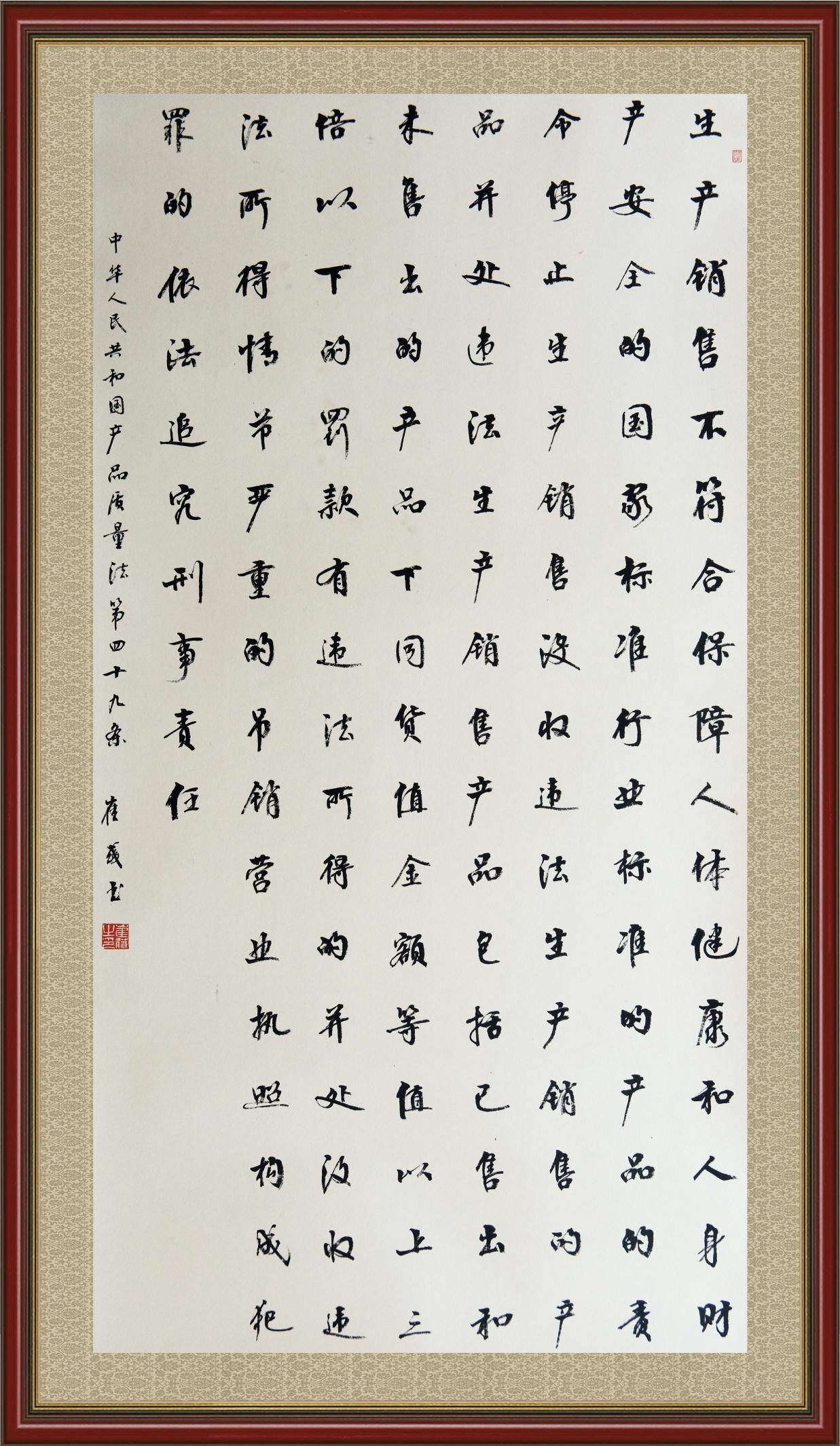 《中華人民共和國產(chǎn)品質(zhì)量法》自1993年9月1日起開始施行,先后進(jìn)行三次修正。作為產(chǎn)品質(zhì)量領(lǐng)域的基本法律,產(chǎn)品質(zhì)量法對(duì)規(guī)范產(chǎn)品質(zhì)量管理、維護(hù)消費(fèi)者合法權(quán)益、促進(jìn)經(jīng)濟(jì)社會(huì)發(fā)展具有重要意義。為更好地學(xué)習(xí)、宣傳、貫徹這部法律,在國家市場(chǎng)監(jiān)督管理總局法規(guī)司的支持下,法治日?qǐng)?bào)社開展了“‘書·法’系列活動(dòng)之書寫《中華人民共和國產(chǎn)品質(zhì)量法》”活動(dòng)。