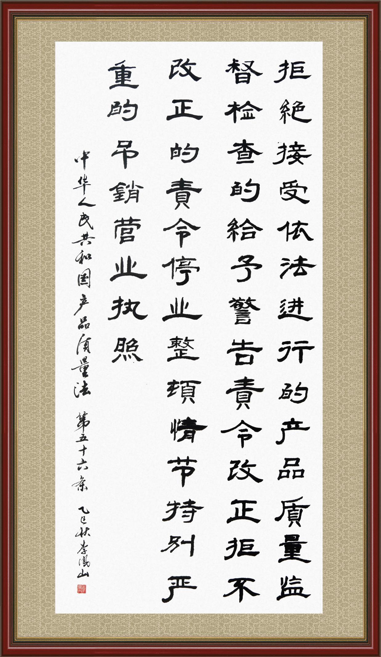《中華人民共和國產(chǎn)品質(zhì)量法》自1993年9月1日起開始施行,先后進(jìn)行三次修正。作為產(chǎn)品質(zhì)量領(lǐng)域的基本法律,產(chǎn)品質(zhì)量法對規(guī)范產(chǎn)品質(zhì)量管理、維護(hù)消費(fèi)者合法權(quán)益、促進(jìn)經(jīng)濟(jì)社會發(fā)展具有重要意義。為更好地學(xué)習(xí)、宣傳、貫徹這部法律,在國家市場監(jiān)督管理總局法規(guī)司的支持下,法治日報社開展了“‘書·法’系列活動之書寫《中華人民共和國產(chǎn)品質(zhì)量法》”活動。