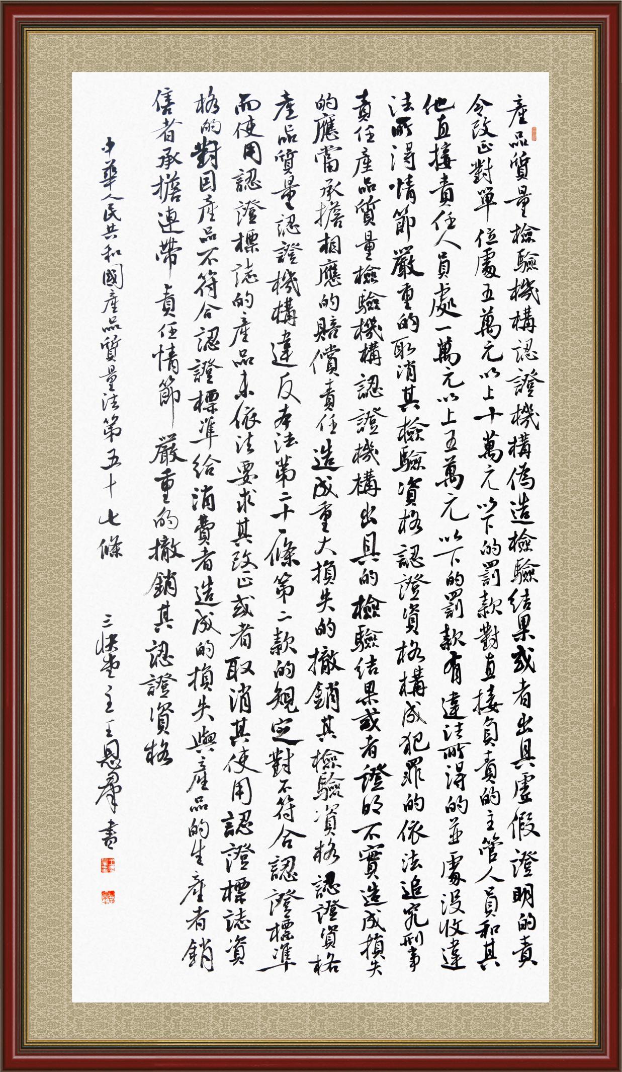 《中華人民共和國產(chǎn)品質量法》自1993年9月1日起開始施行,先后進行三次修正。作為產(chǎn)品質量領域的基本法律,產(chǎn)品質量法對規(guī)范產(chǎn)品質量管理、維護消費者合法權益、促進經(jīng)濟社會發(fā)展具有重要意義。為更好地學習、宣傳、貫徹這部法律,在國家市場監(jiān)督管理總局法規(guī)司的支持下,法治日報社開展了“‘書·法’系列活動之書寫《中華人民共和國產(chǎn)品質量法》”活動。