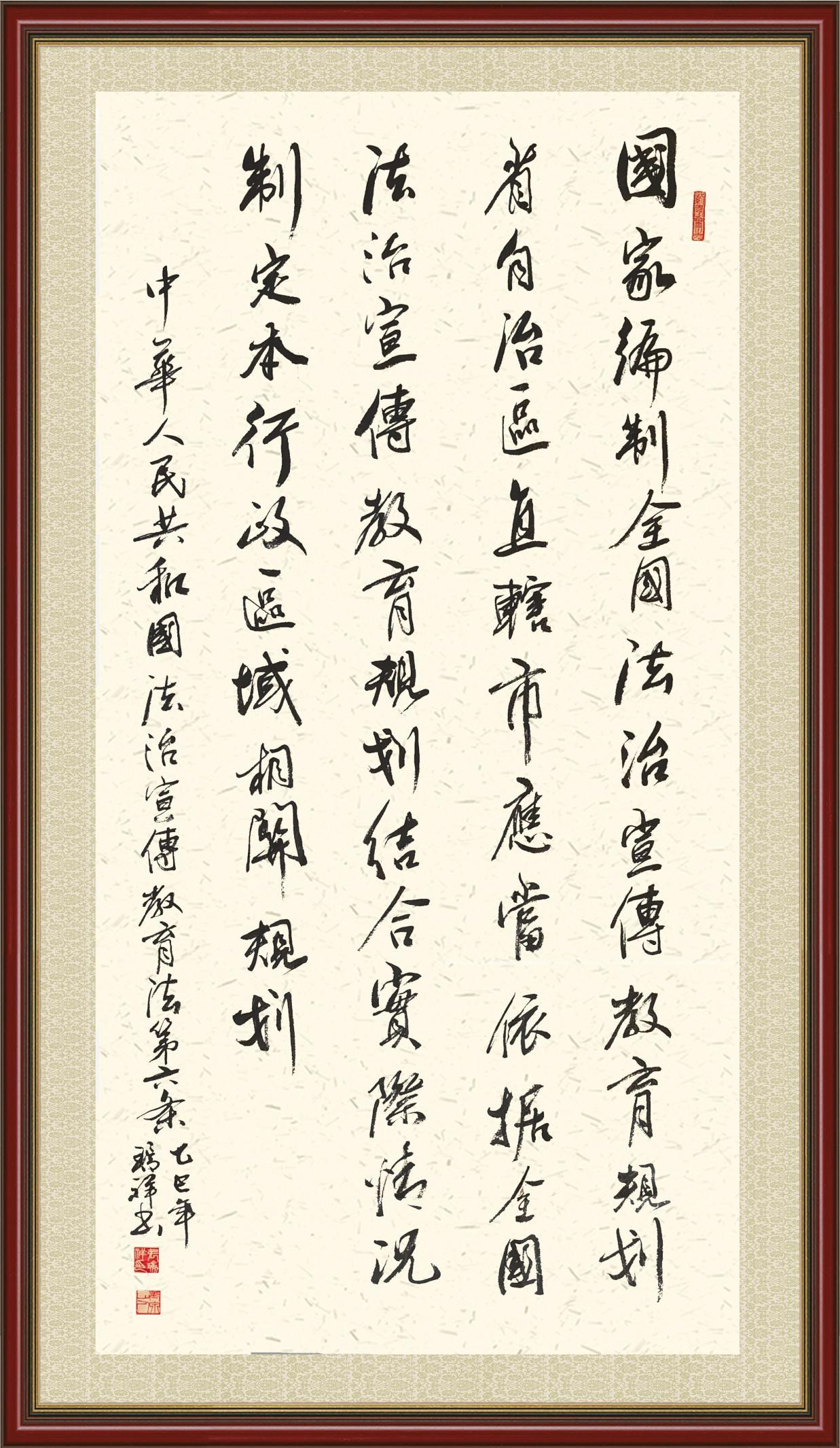 2020年7月11日,由法治日?qǐng)?bào)社主辦的“書(shū)·法”系列活動(dòng)正式啟動(dòng),先后書(shū)寫(xiě)《中華人民共和國(guó)民法典》《中華人民共和國(guó)憲法》《中華人民共和國(guó)民營(yíng)經(jīng)濟(jì)促進(jìn)法》等21部法律法規(guī)。