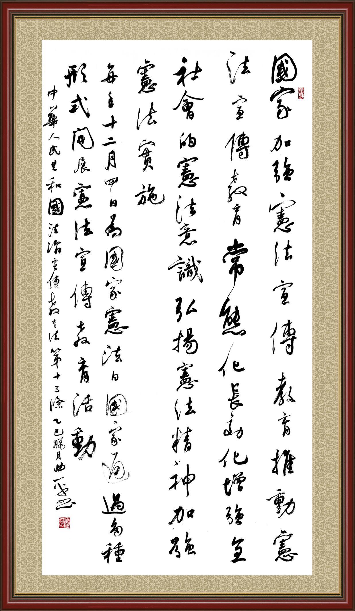 2020年7月11日,由法治日報(bào)社主辦的“書·法”系列活動(dòng)正式啟動(dòng),先后書寫《中華人民共和國民法典》《中華人民共和國憲法》《中華人民共和國民營經(jīng)濟(jì)促進(jìn)法》等21部法律法規(guī)。