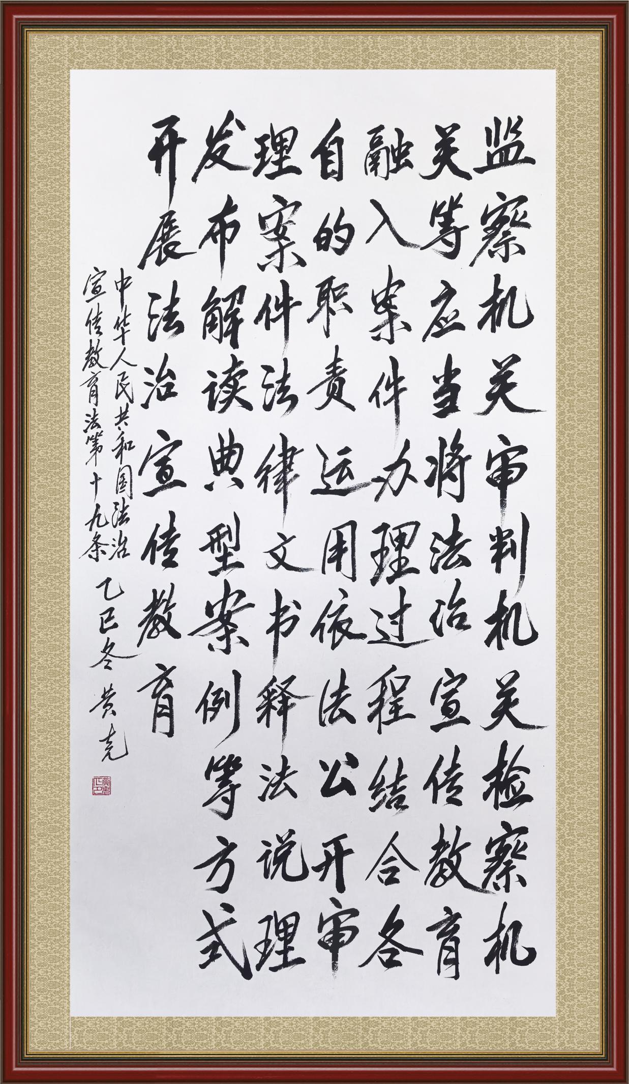 2020年7月11日,由法治日?qǐng)?bào)社主辦的“書·法”系列活動(dòng)正式啟動(dòng),先后書寫《中華人民共和國民法典》《中華人民共和國憲法》《中華人民共和國民營經(jīng)濟(jì)促進(jìn)法》等21部法律法規(guī)。