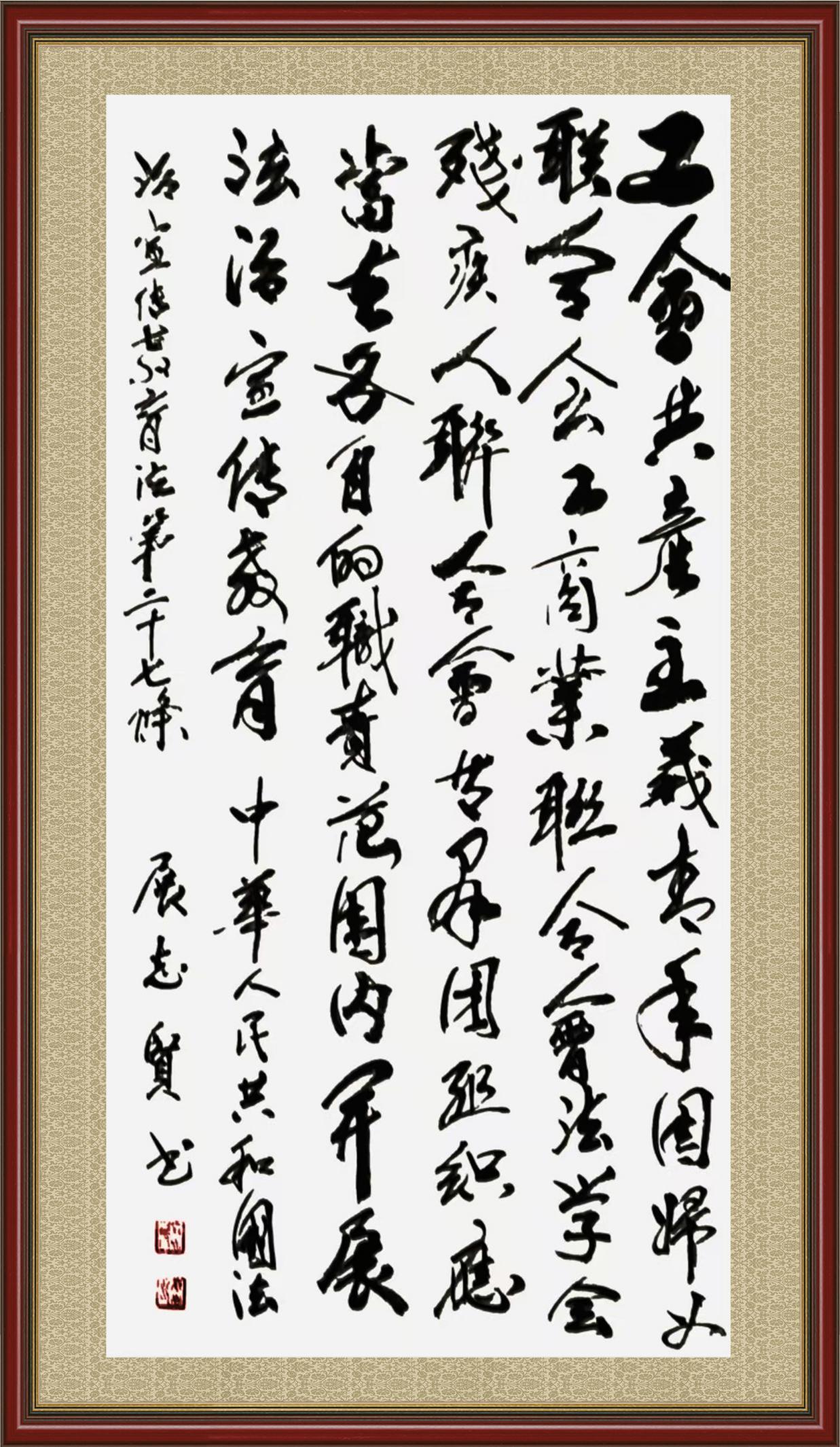 2020年7月11日,由法治日?qǐng)?bào)社主辦的“書·法”系列活動(dòng)正式啟動(dòng),先后書寫《中華人民共和國(guó)民法典》《中華人民共和國(guó)憲法》《中華人民共和國(guó)民營(yíng)經(jīng)濟(jì)促進(jìn)法》等21部法律法規(guī)。