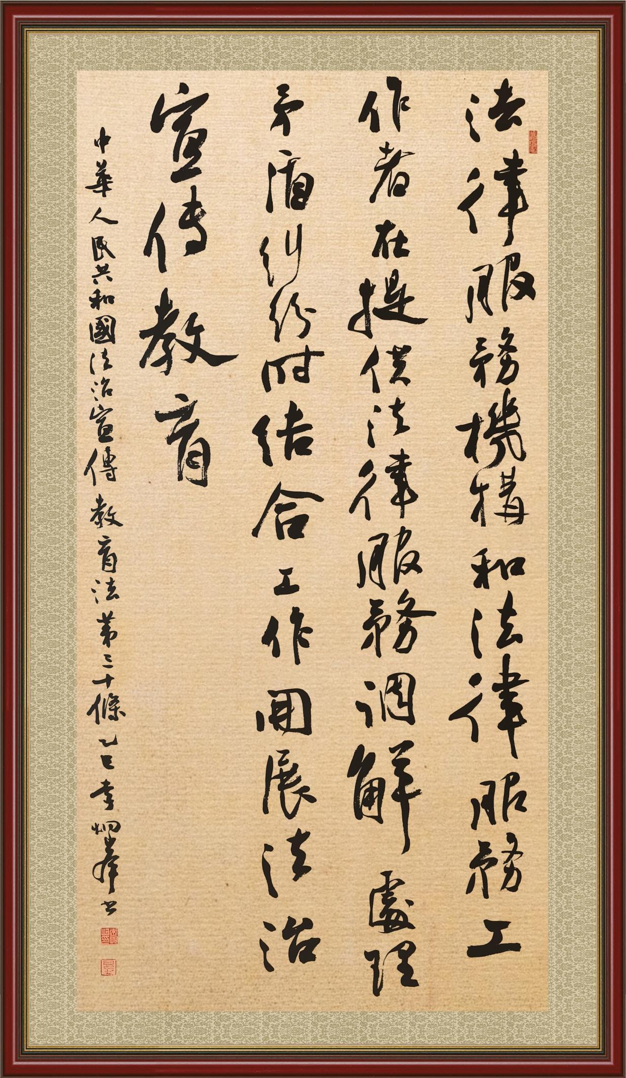 2020年7月11日,由法治日?qǐng)?bào)社主辦的“書(shū)·法”系列活動(dòng)正式啟動(dòng),先后書(shū)寫(xiě)《中華人民共和國(guó)民法典》《中華人民共和國(guó)憲法》《中華人民共和國(guó)民營(yíng)經(jīng)濟(jì)促進(jìn)法》等21部法律法規(guī)。