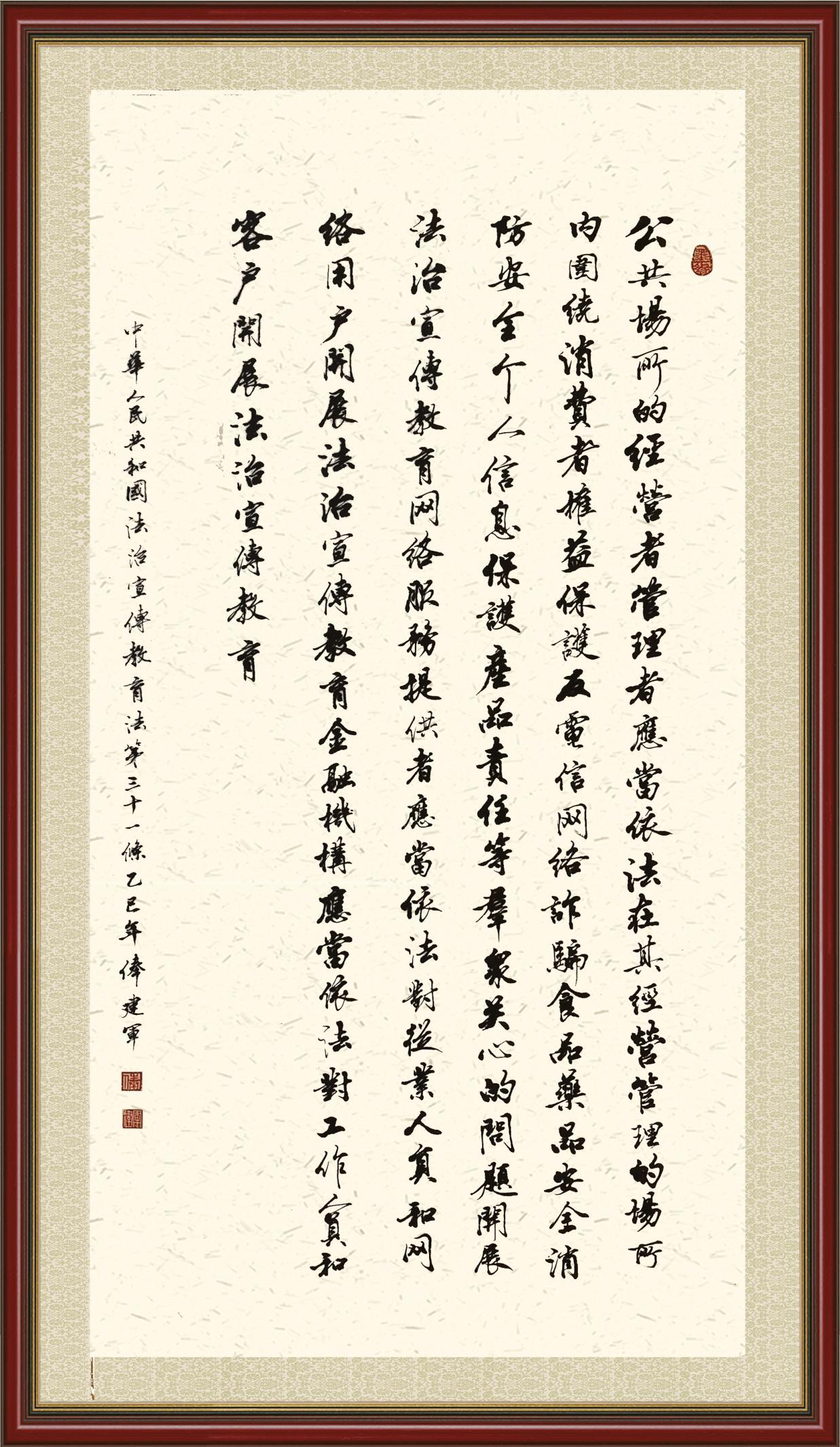 2020年7月11日,由法治日報社主辦的“書·法”系列活動正式啟動,先后書寫《中華人民共和國民法典》《中華人民共和國憲法》《中華人民共和國民營經(jīng)濟促進法》等21部法律法規(guī)。