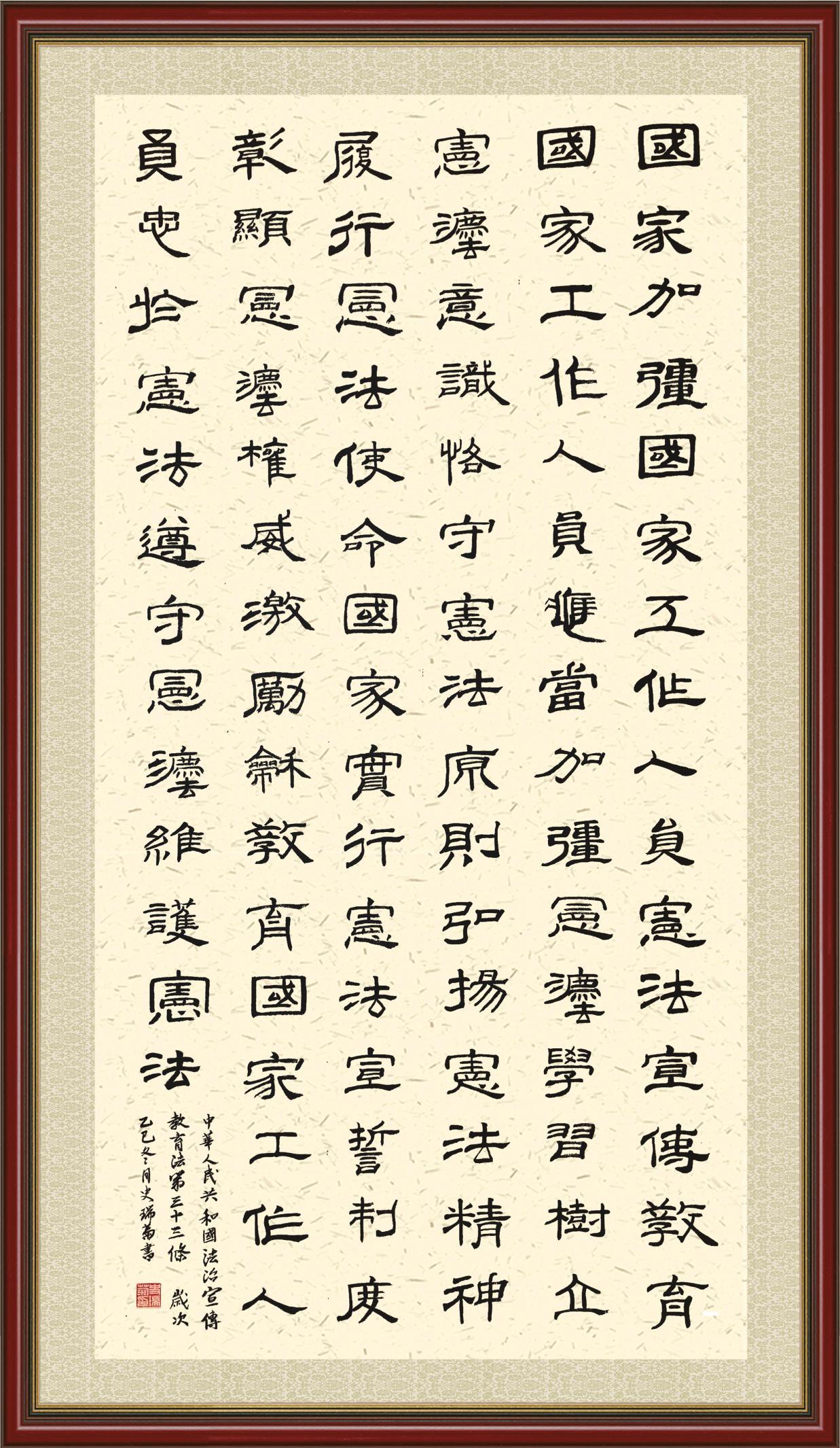 2020年7月11日,由法治日報社主辦的“書·法”系列活動正式啟動,先后書寫《中華人民共和國民法典》《中華人民共和國憲法》《中華人民共和國民營經(jīng)濟促進法》等21部法律法規(guī)。