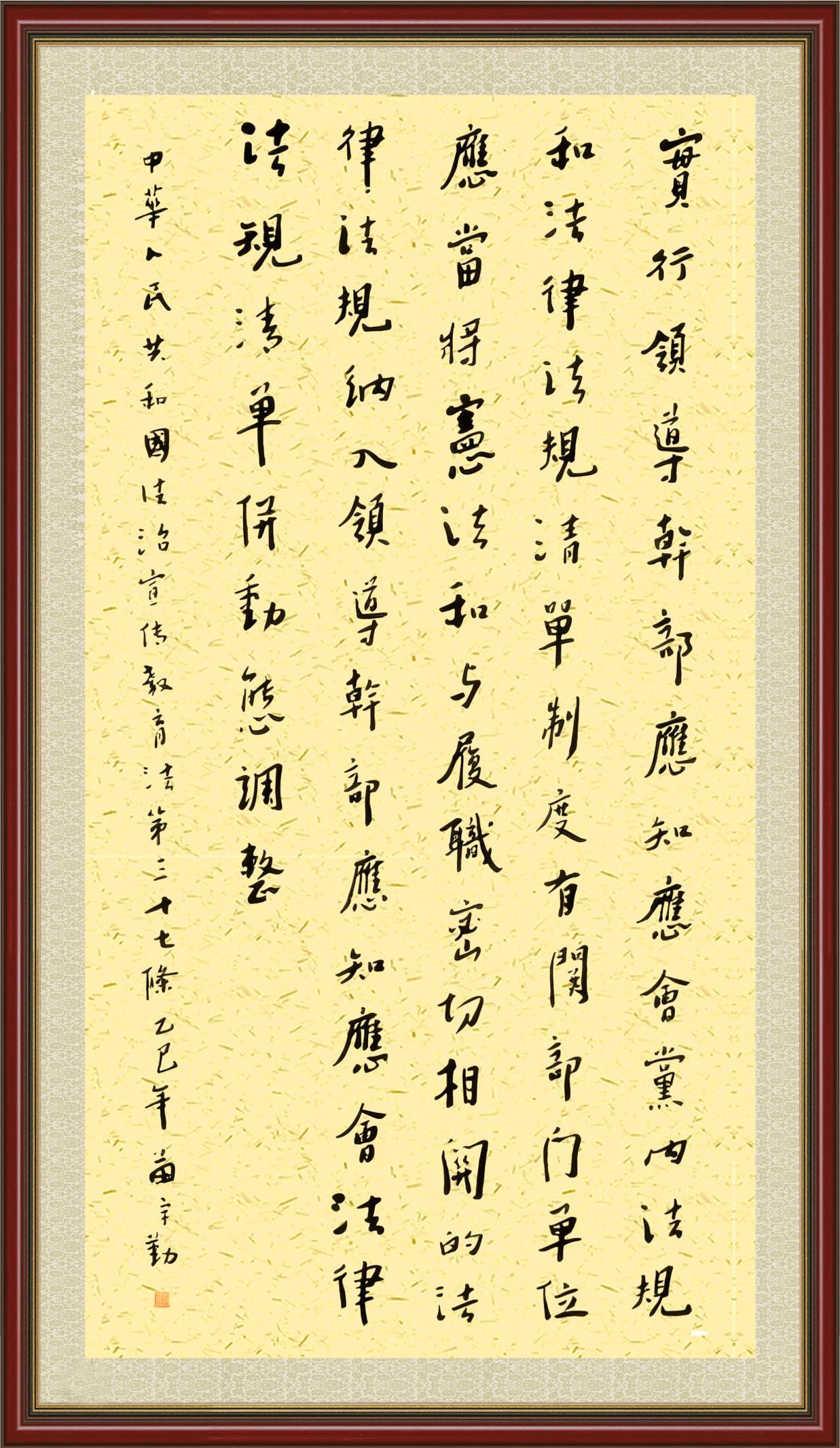 2020年7月11日,由法治日?qǐng)?bào)社主辦的“書·法”系列活動(dòng)正式啟動(dòng),先后書寫《中華人民共和國(guó)民法典》《中華人民共和國(guó)憲法》《中華人民共和國(guó)民營(yíng)經(jīng)濟(jì)促進(jìn)法》等21部法律法規(guī)。