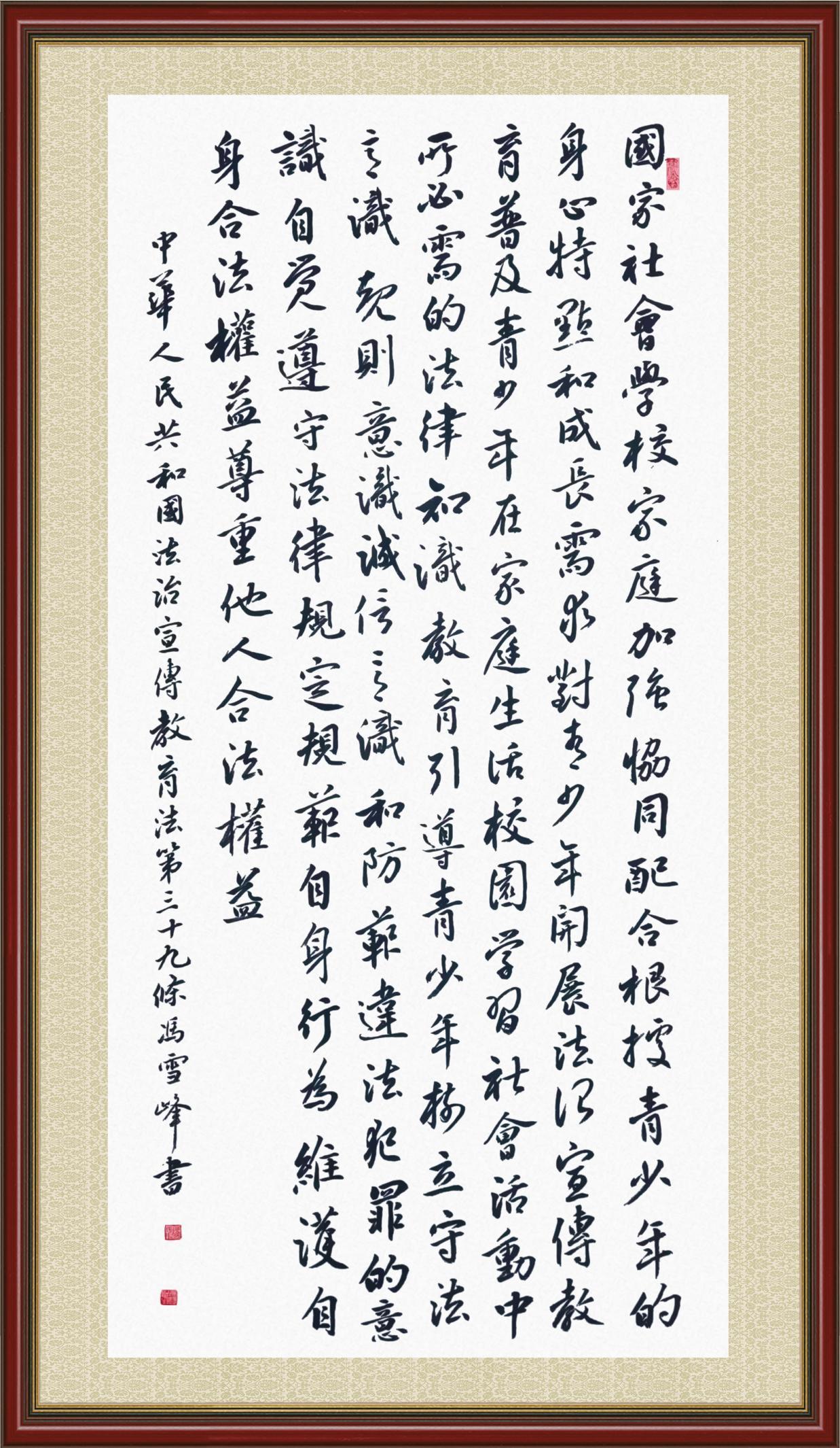 《中華人民共和國法治宣傳教育法》自2025年11月1日起開始施行。法治宣傳教育是全面依法治國的長期基礎性工作。法治宣傳教育法對提升全民法治素養(yǎng)和社會治理法治化水平、推動建設更高水平的社會主義法治國家具有重要意義。為更好地學習、宣傳、貫徹這部法律,法治日報社聯(lián)合司法部普法與依法治理局,開展了“‘書·法’系列活動之書寫《中華人民共和國法治宣傳教育法》”活動。