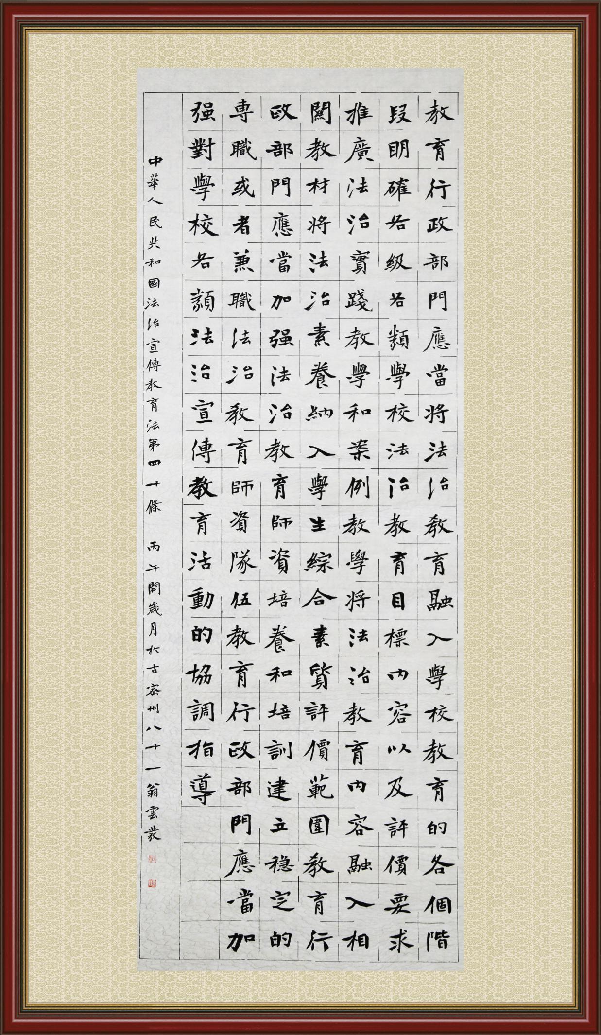 2020年7月11日,由法治日報社主辦的“書·法”系列活動正式啟動,先后書寫《中華人民共和國民法典》《中華人民共和國憲法》《中華人民共和國民營經(jīng)濟促進法》等21部法律法規(guī)。