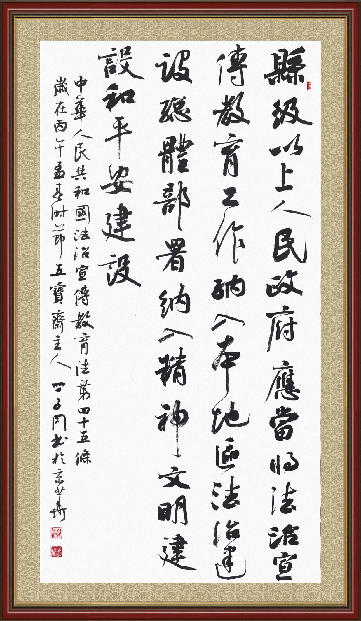 2020年7月11日,由法治日報社主辦的“書·法”系列活動正式啟動,先后書寫《中華人民共和國民法典》《中華人民共和國憲法》《中華人民共和國民營經(jīng)濟促進法》等21部法律法規(guī)。