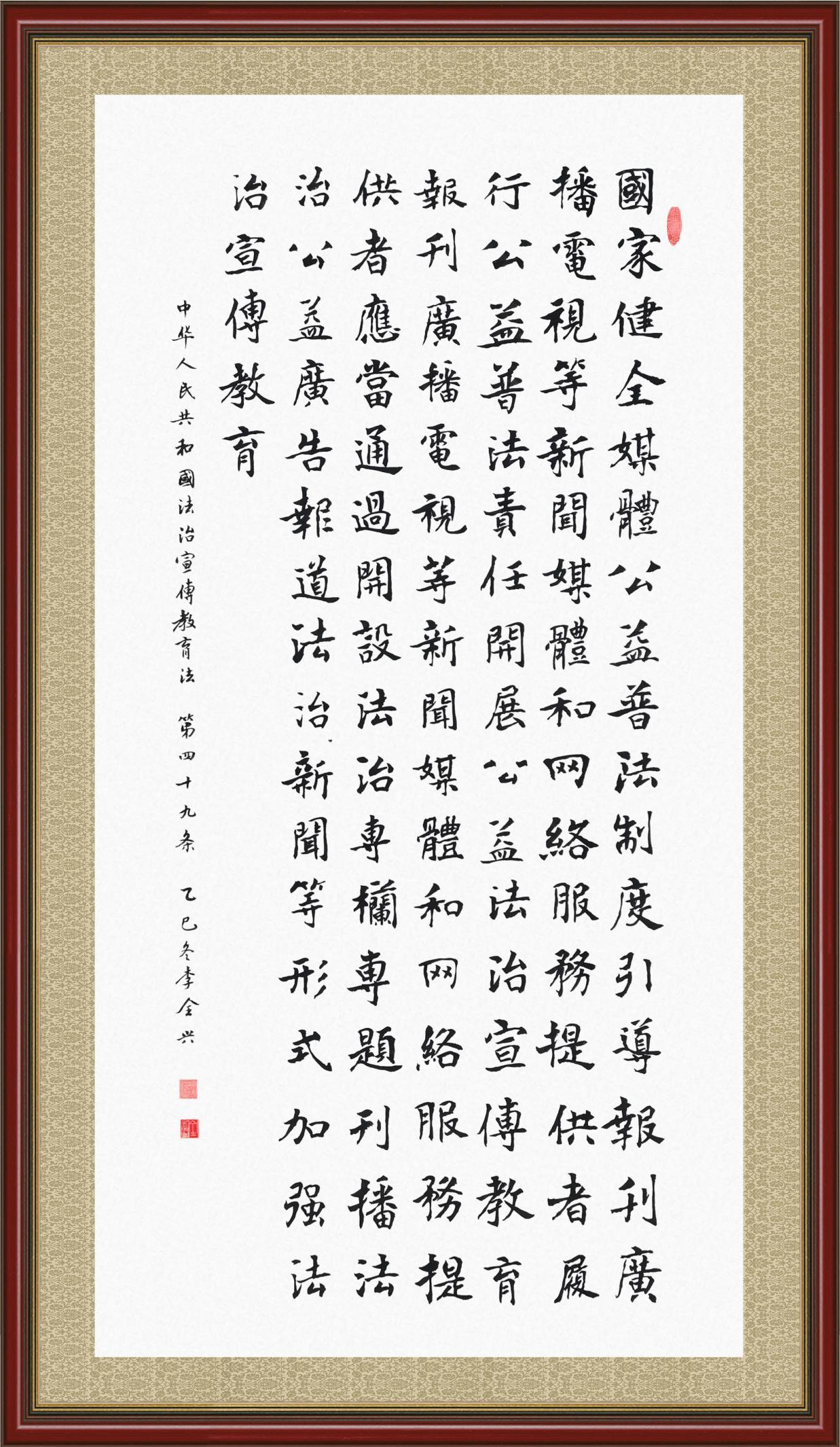 2020年7月11日,由法治日報社主辦的“書·法”系列活動正式啟動,先后書寫《中華人民共和國民法典》《中華人民共和國憲法》《中華人民共和國民營經(jīng)濟(jì)促進(jìn)法》等21部法律法規(guī)。