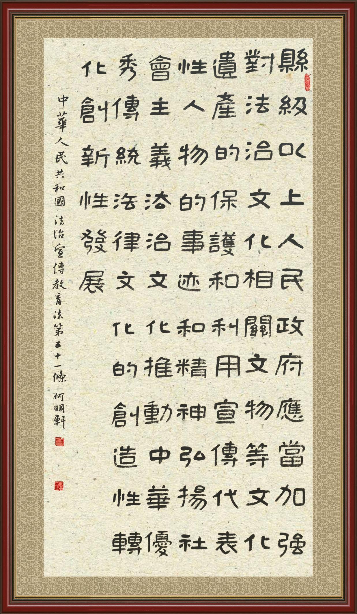2020年7月11日,由法治日報社主辦的“書·法”系列活動正式啟動,先后書寫《中華人民共和國民法典》《中華人民共和國憲法》《中華人民共和國民營經(jīng)濟促進法》等21部法律法規(guī)。
