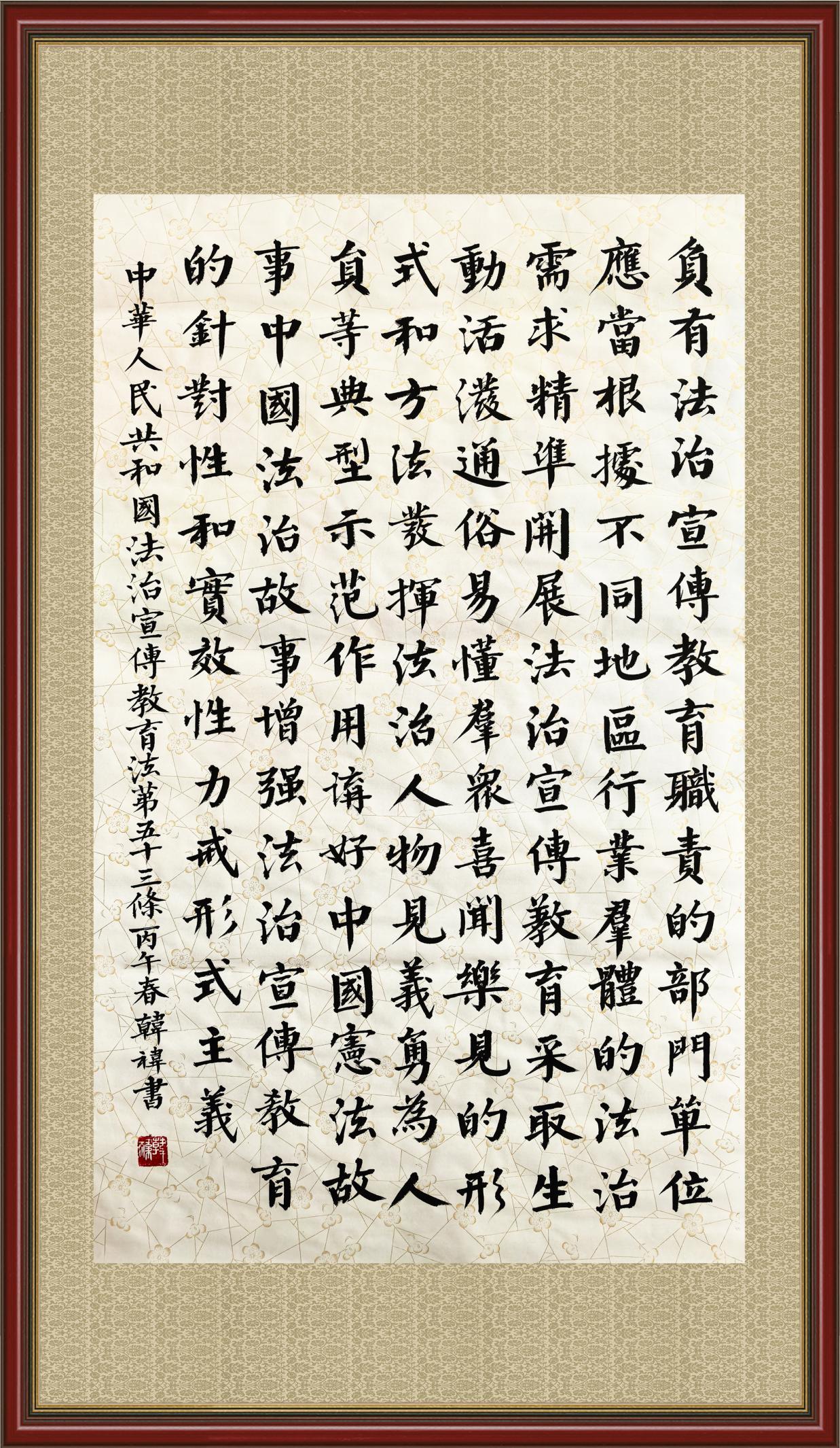 2020年7月11日,由法治日報社主辦的“書·法”系列活動正式啟動,先后書寫《中華人民共和國民法典》《中華人民共和國憲法》《中華人民共和國民營經(jīng)濟(jì)促進(jìn)法》等21部法律法規(guī)。
