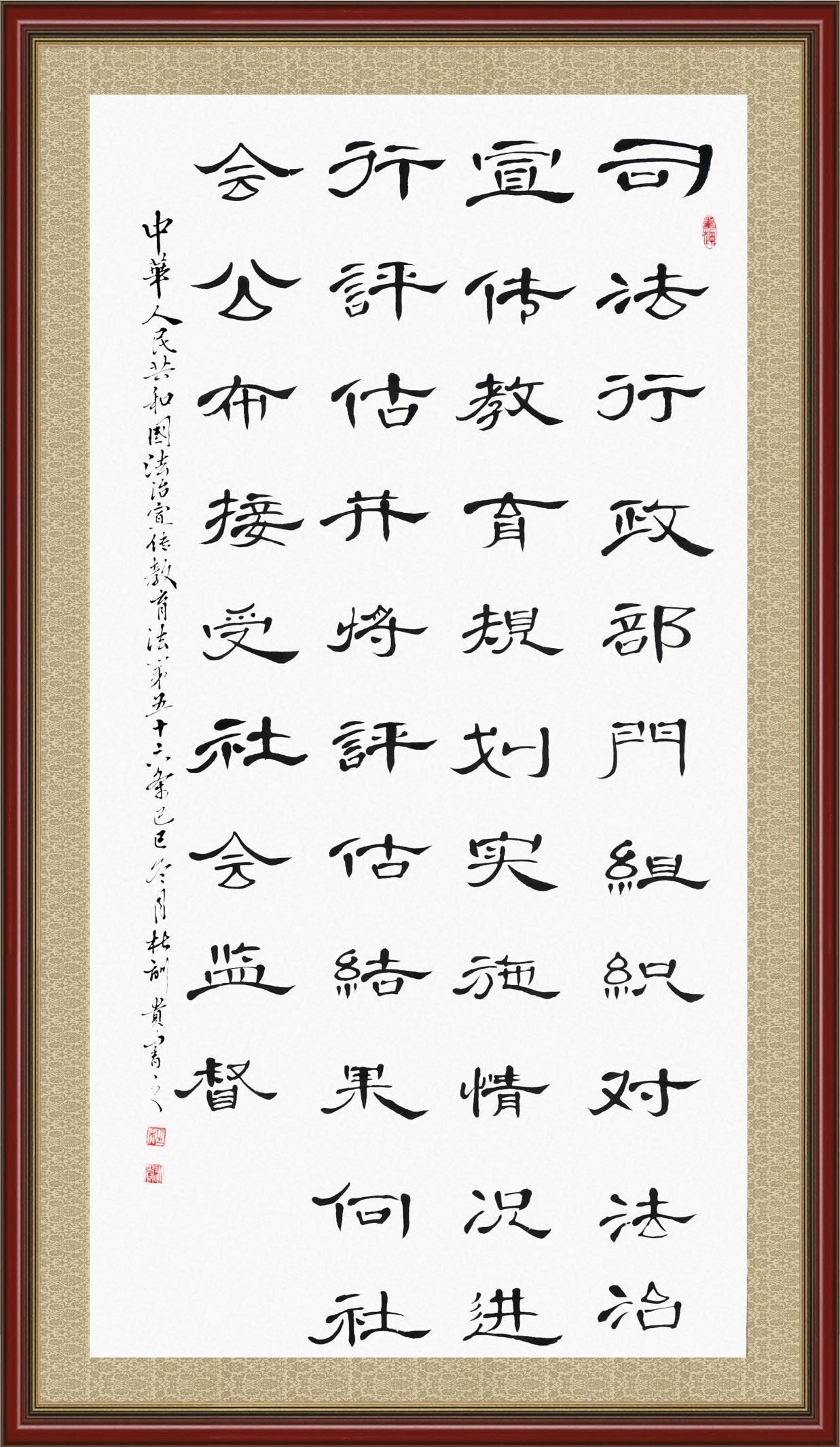 2020年7月11日,由法治日報社主辦的“書·法”系列活動正式啟動,先后書寫《中華人民共和國民法典》《中華人民共和國憲法》《中華人民共和國民營經濟促進法》等21部法律法規(guī)。