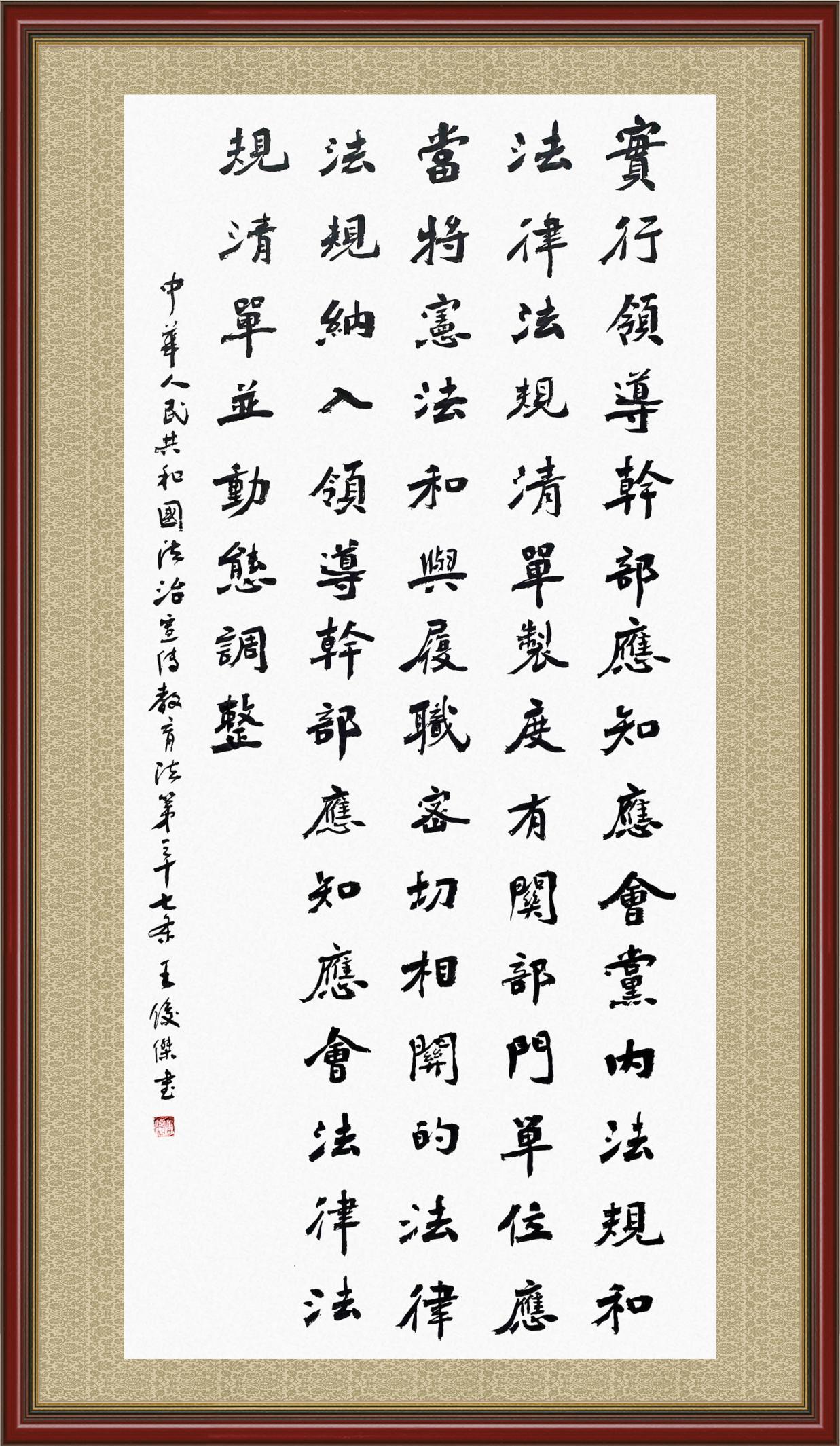 2020年7月11日,由法治日?qǐng)?bào)社主辦的“書(shū)·法”系列活動(dòng)正式啟動(dòng),先后書(shū)寫(xiě)《中華人民共和國(guó)民法典》《中華人民共和國(guó)憲法》《中華人民共和國(guó)民營(yíng)經(jīng)濟(jì)促進(jìn)法》等21部法律法規(guī)。