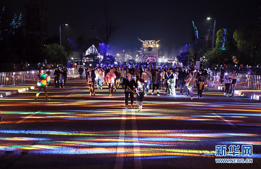 1月31日晚,天河潭景區(qū)內(nèi)的道路“流光溢彩”。新華網(wǎng) 盧志佳 攝