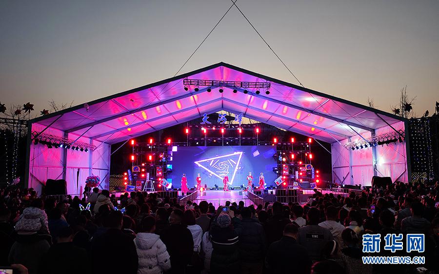 1月31日晚,天河潭景區(qū)廣場上舉行走秀、歌舞、雜技等舞臺演藝。新華網(wǎng) 盧志佳 攝