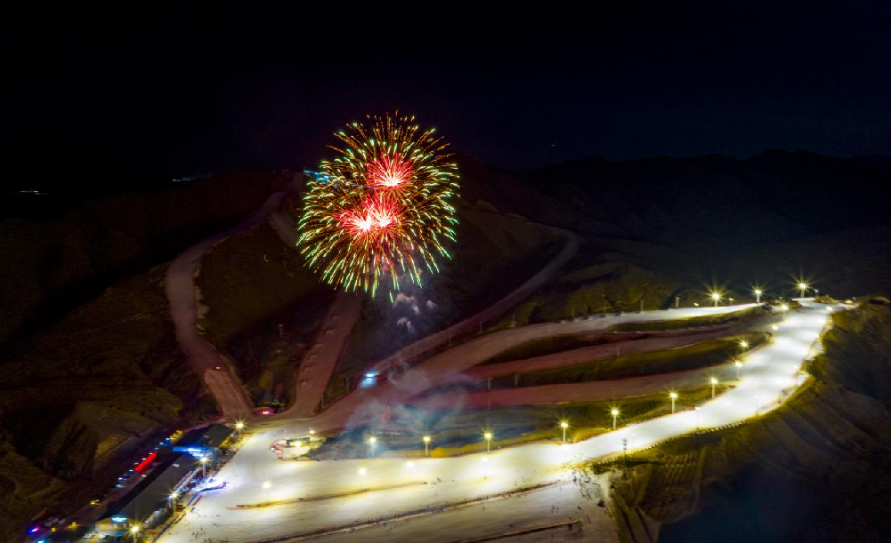 2月5日,馬鬃山滑雪場上演大型雪地?zé)熁ㄐ悖舜罅坑慰陀^看。(無人機(jī)照片)新華網(wǎng)發(fā)(樂炎 攝)