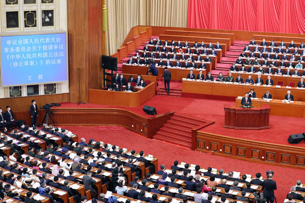 3月5日,第十三屆全國(guó)人大常委會(huì)副委員長(zhǎng)王晨在第十四屆全國(guó)人民代表大會(huì)第一次會(huì)議上作關(guān)于《中華人民共和國(guó)立法法(修正草案)》的說明。新華社記者 龐興雷 攝