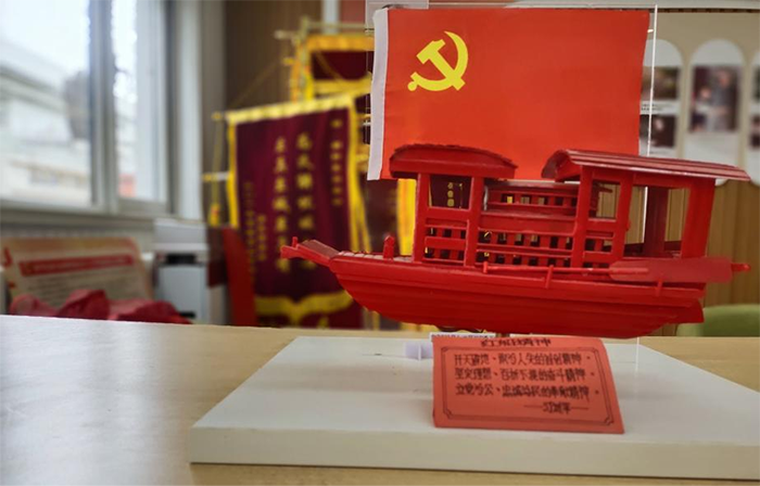 走進朝陽里社區(qū)的和平區(qū)社區(qū)志愿服務(wù)展館,一艘紅色的小船模型靜靜地??吭谌肟谔幍臅郎希〈纳戏?,懸掛著一面袖珍的黨旗。