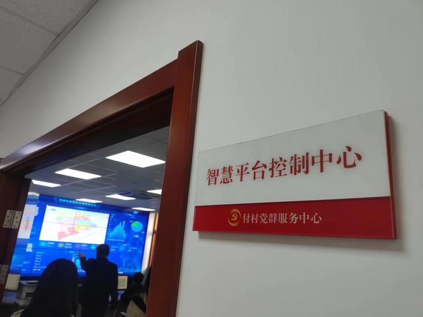 “各位現(xiàn)在看到的就是電腦端的一個界面,屏幕的中間是我們付村的一個平面圖,下面展示的是人口組成……”在付村的智慧平臺控制中心,工作人員站在一塊藍色屏幕前對記者進行講解。