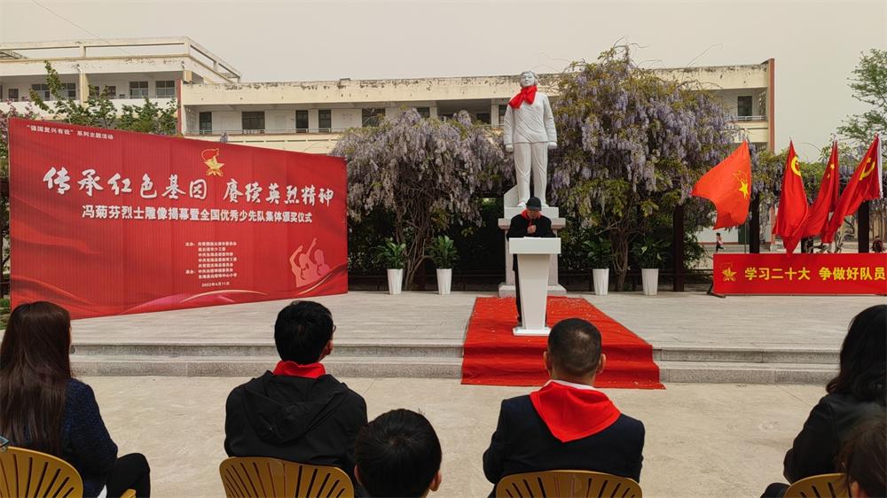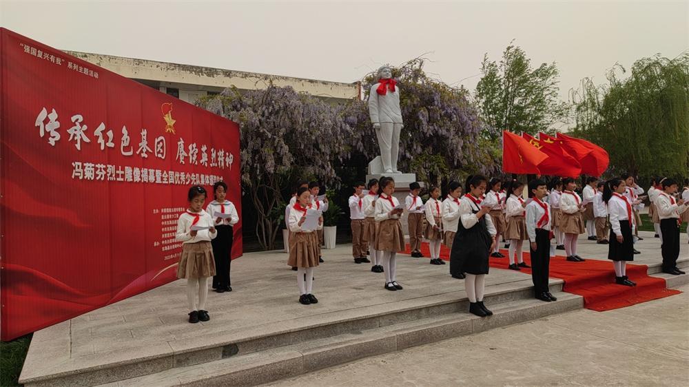 活動現(xiàn)場,出席儀式的幾位領(lǐng)導(dǎo)和少先隊員代表緩緩地為“雨花英烈”之一的馮菊芬烈士塑像揭幕,褪去紅布的烈士塑像在藍(lán)天白云下愈顯純潔高大、莊嚴(yán)而肅穆。