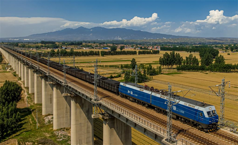 迎峰度夏保障重點(diǎn)物資安全高效運(yùn)輸,一列滿(mǎn)載電煤的重載列車(chē)行駛在山西省臨汾綜合段管內(nèi)的師村特大橋下行線(xiàn)上。新華社發(fā)(張睿攝)