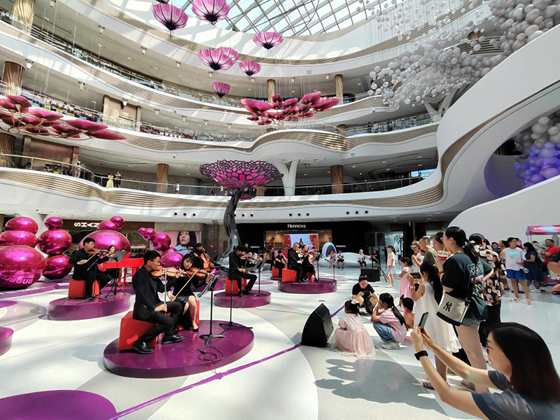 端午假期,海口國際免稅城內(nèi),伴隨著悠揚(yáng)的音樂,陽光傾瀉“天際秘林”夢幻舞臺,正在購物的游客們紛紛駐足欣賞?!耙粓鍪覂?nèi)音樂會,給購物消費(fèi)增添了新意和氛圍感?!焙?谑忻耜惱俪两陉柟夂鸵魳分小?/p>