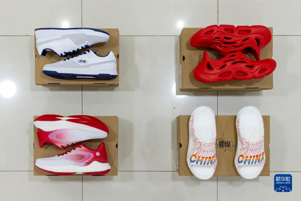 這是7月24日拍攝的第31屆世界大學(xué)生夏季運動會中國代表團成員配發(fā)裝備中的不同功能的鞋。新華社記者 沈伯韓 攝