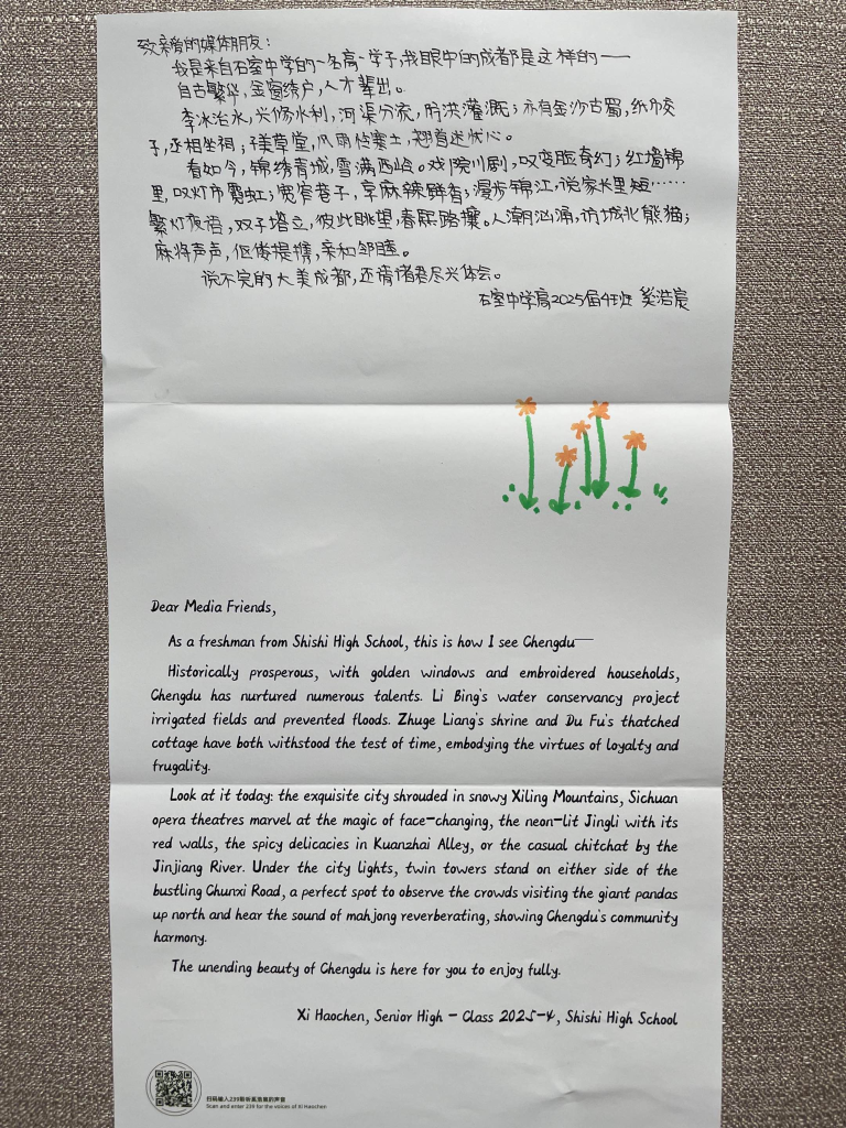 ↑圖為四川省成都市石室中學高2025屆4班奚浩宸親筆書寫的信件。
