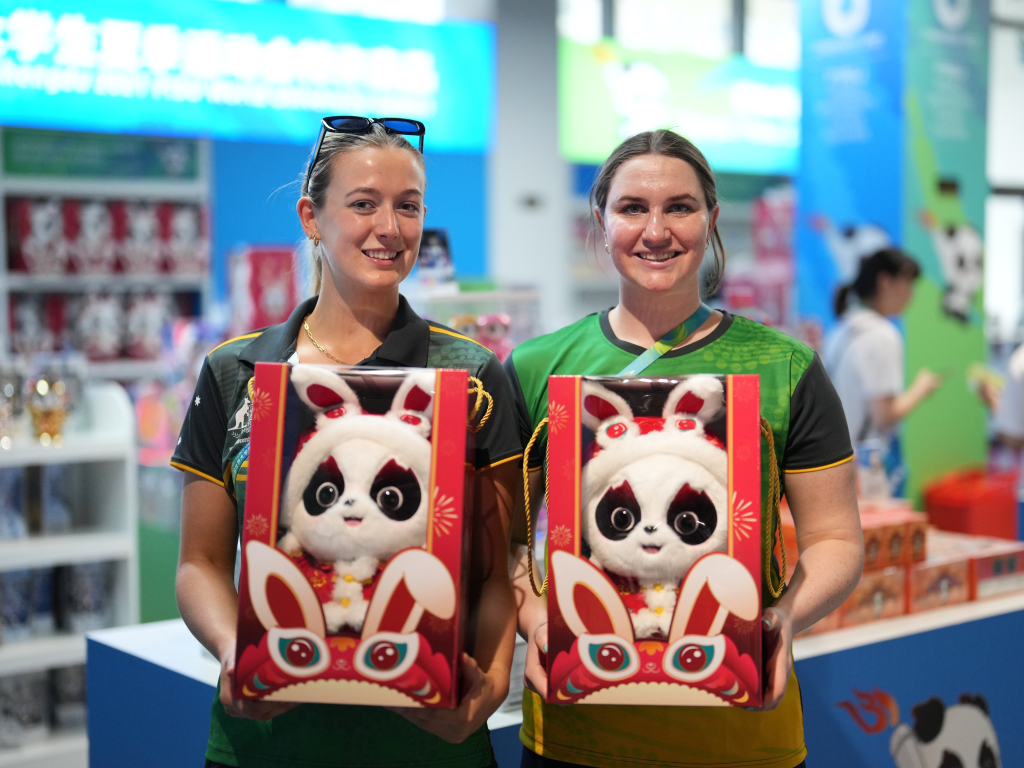 ↑澳大利亞水球隊的露辛達·蘇珊(左)和隊友展示剛剛買到的兔年版“蓉寶”。