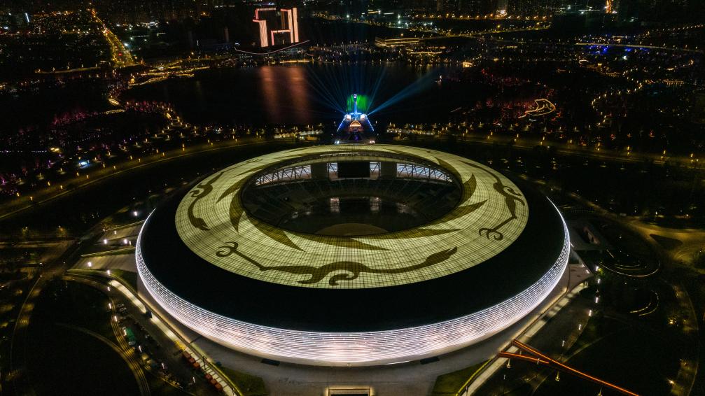 ↑這是4月19日拍攝的第31屆世界大學生夏季運動會開幕式主體育場及主火炬(無人機照片)