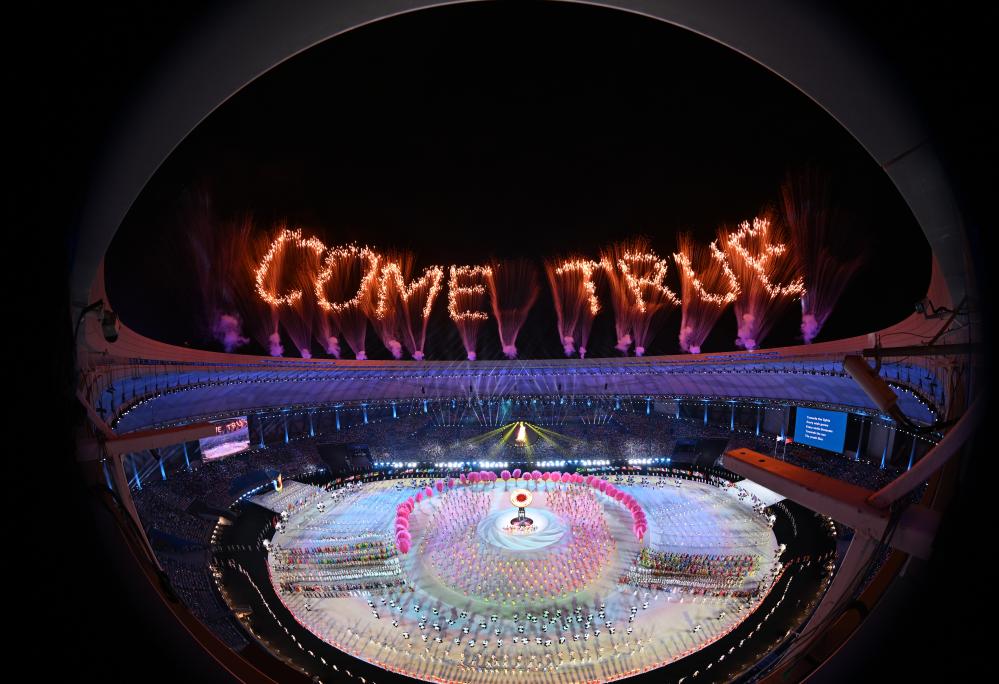 成都成就夢想。隨著大運(yùn)會(huì)火炬塔被點(diǎn)燃,焰火在空中打出成都大運(yùn)會(huì)的U形會(huì)徽,體育場上空焰火呈現(xiàn)英文字樣“Make Dreams Come True”。