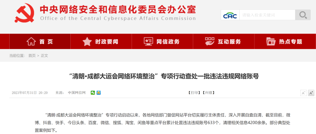 中央網(wǎng)信辦通報(bào)了部分典型處置案例,包括傳播大運(yùn)會(huì)謠言信息、利用“偽公益”惡意營銷炒作、假冒仿冒賬號(hào)發(fā)布信息、發(fā)布涉大運(yùn)會(huì)違規(guī)售賣信息等。