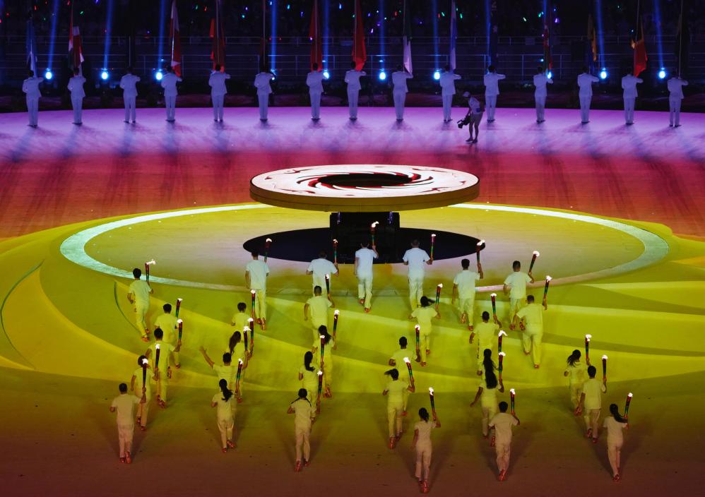 7月28日,火炬手在成都大運(yùn)會(huì)開幕式上入場(chǎng)。新華社記者 李欣 攝