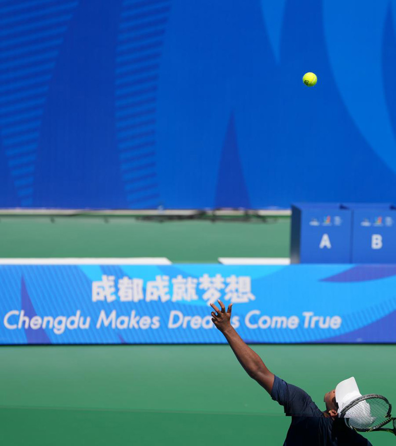 運(yùn)動員在成都大運(yùn)會網(wǎng)球比賽中揮拍。新華社記者 李京 攝